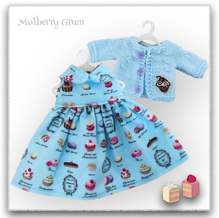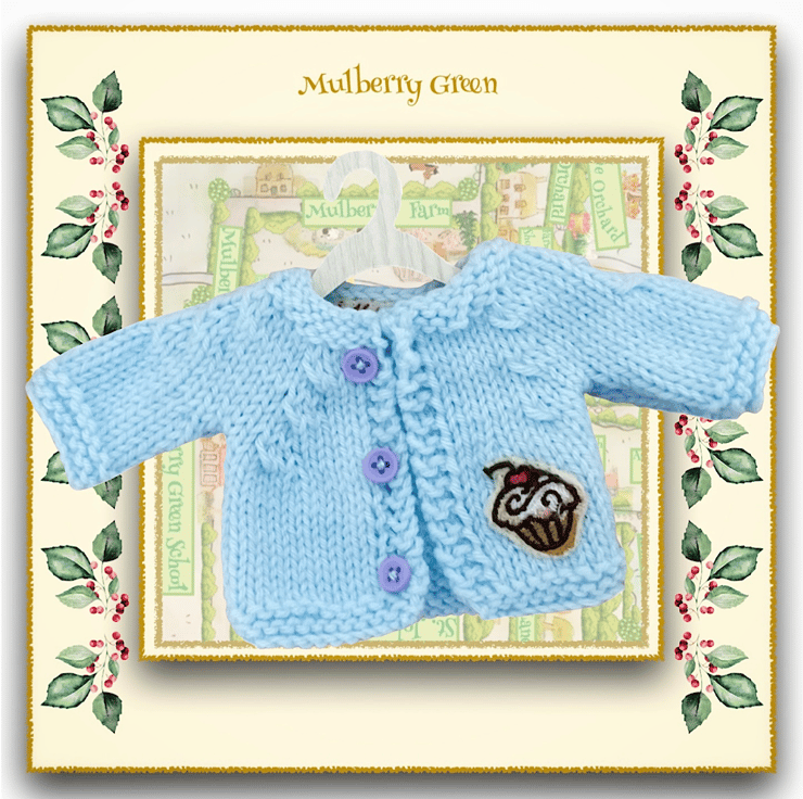 A pretty little pale blue cardigan embroidered with a little cupcake, to fit the Mulberry Green characters. The cardigan is hand knitted and is finished with little purple buttons.