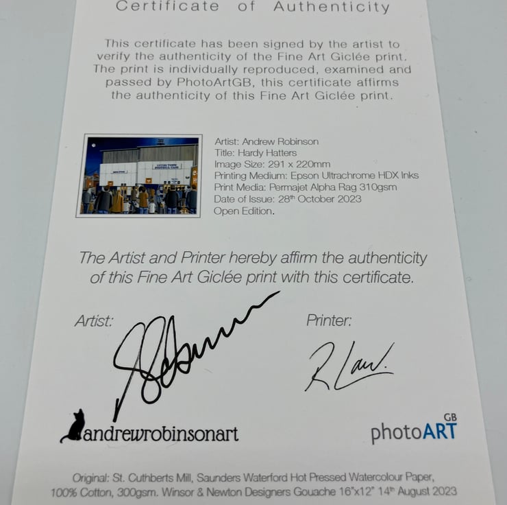 The framed print comes with a 'Certificate of Authenticity' which documents the details of the original painting and the art print. The Certificate of Authenticity is affirmed with a signature from both myself (the artist) and the printer.