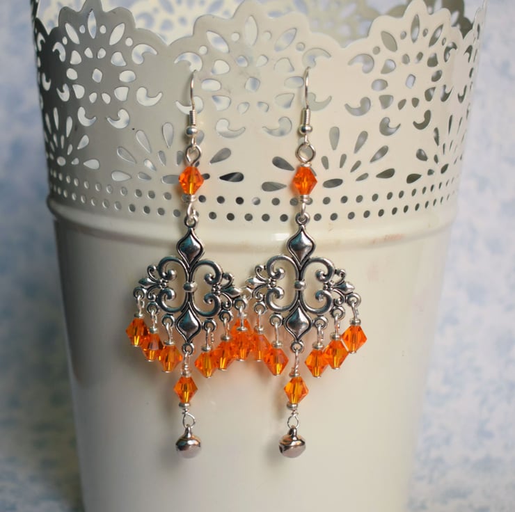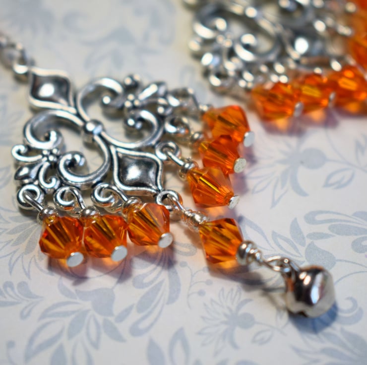 These have been made with a fleur de lys chandelier piece hung with orange glass bicone beads and with the central, longest, drop finished with a tiny silver bell giving them a bit of a boho vibe.