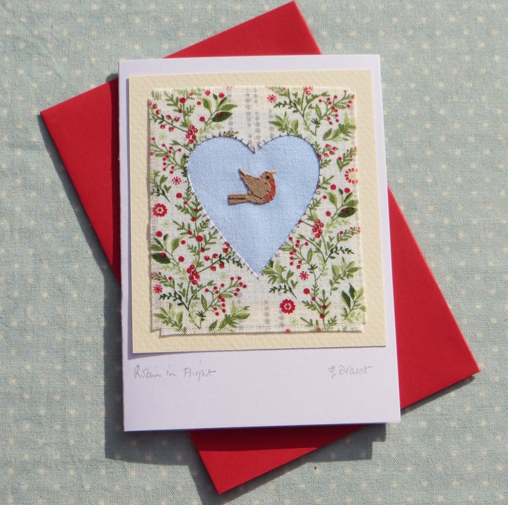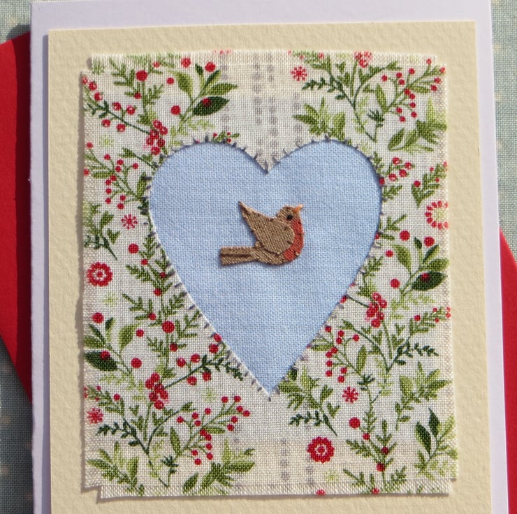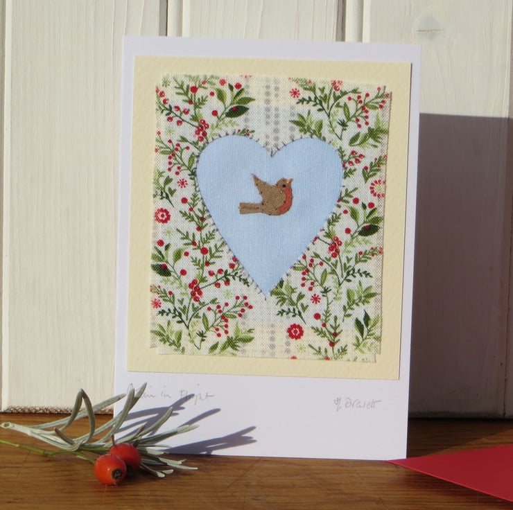 A hand-stitched miniature applique robin with embroidered details set within a heart shaped window cut from pretty cotton print of greenery; tiny stitches around the edge of the heart to keep everything in place - a card to keep!