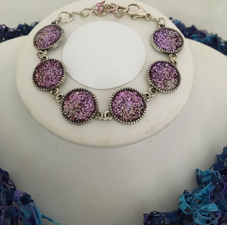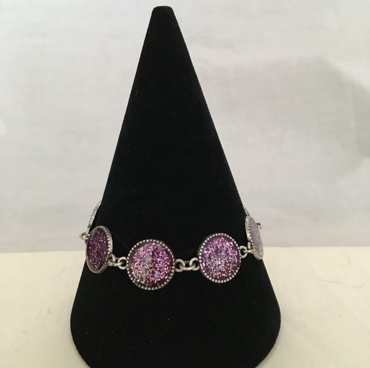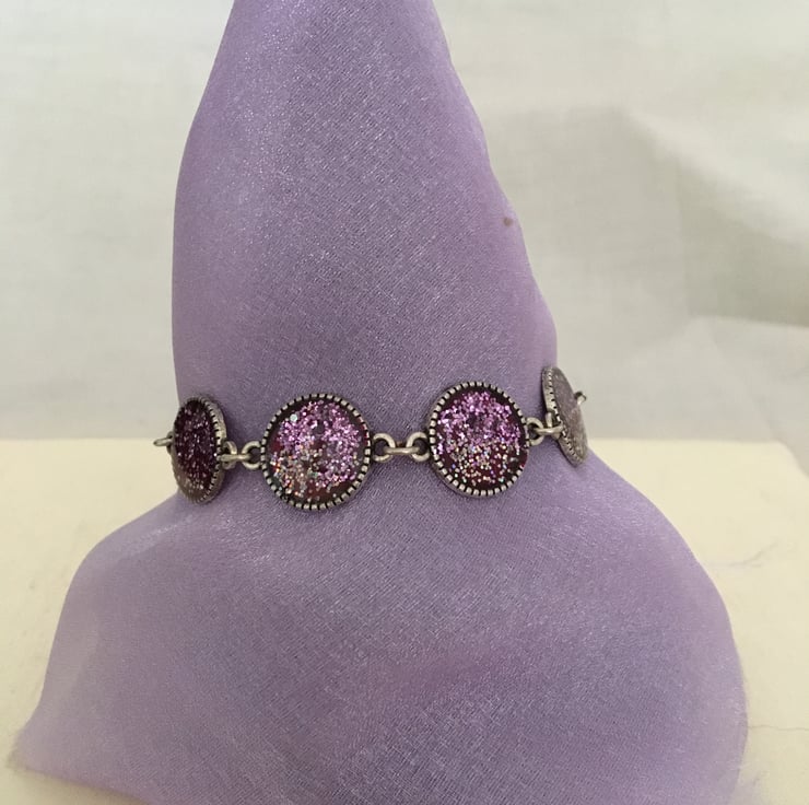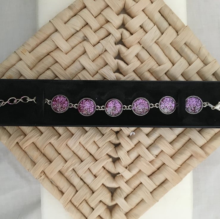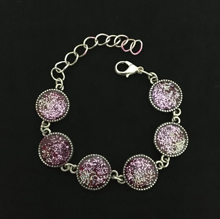 The each round is created using a two part colour and glitter base mix with a 2 part resin mix overlay, the colours gently catch the light as the bracelet moves when worn.
