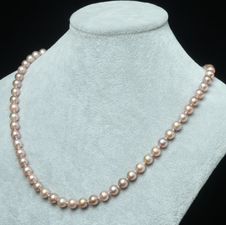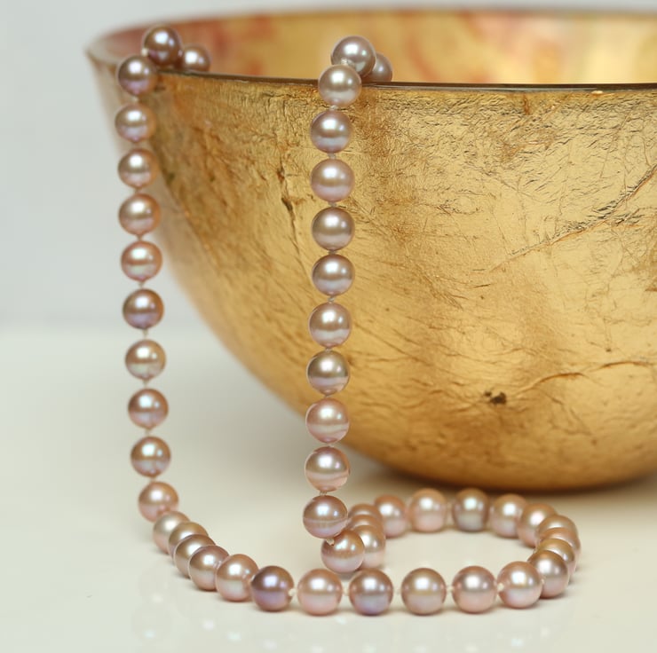 Some pretty 7mm round freshwater pearls in natural colours: light pink with a slight hue of lavender. The pearls are good quality (graded AAplus by a reputable pearl dealer), smooth with a few minor marks, mainly round with some being just slightly off spherical. See photos for more detail, but please be aware that there might be some variance in how your monitor shows the colours.