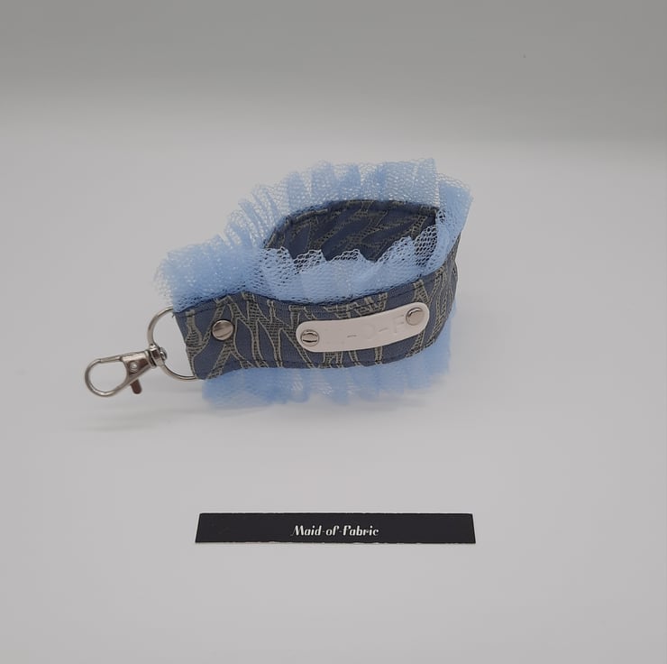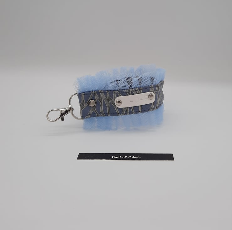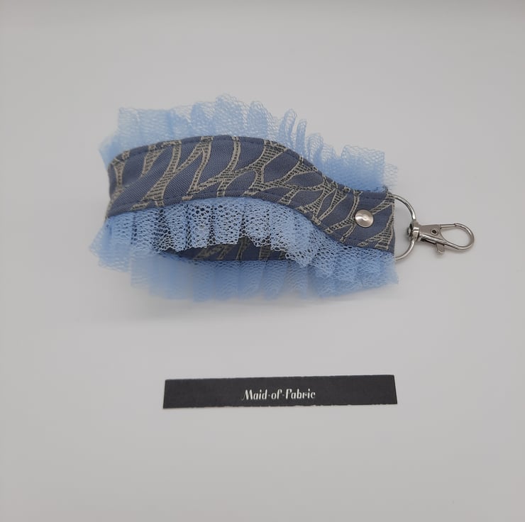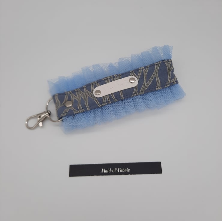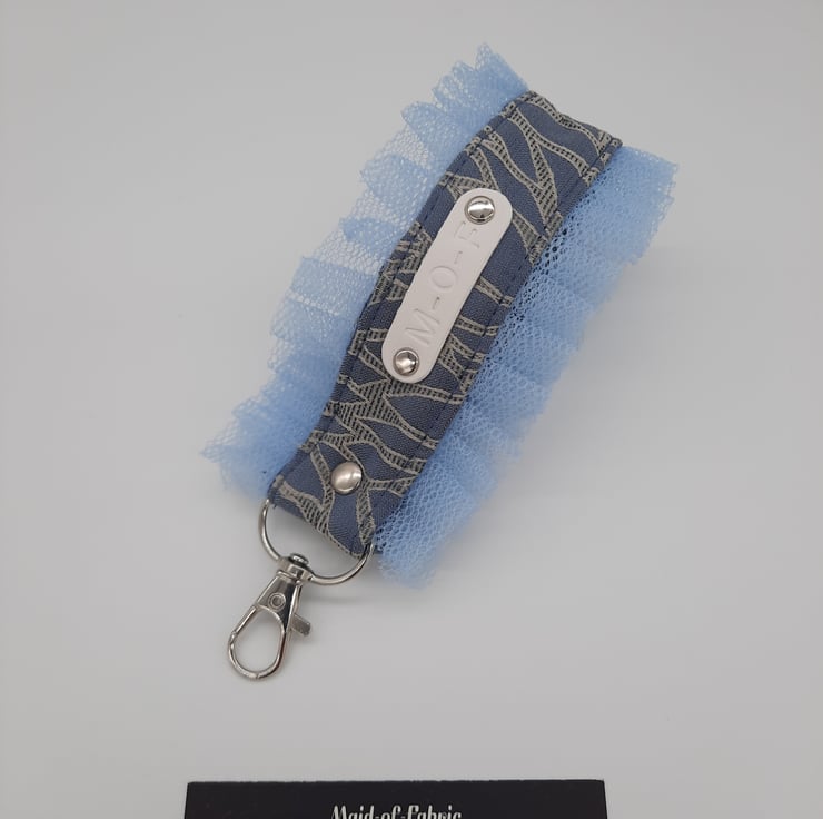 Keyring fob wristlet. Made with a blue and beige weaved fabric and tulle for the frilled edge.