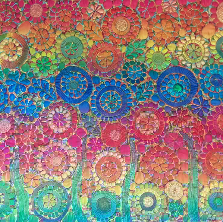 This is a large artwork with hand dyed Egyptian cotton and silks, appliqué and free motion embroidery.