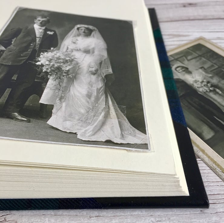 A beautiful extra-large artisan photo album, personalised and covered with your family tartan! Perfect for all your wedding photos or as an heirloom family album. This album is acid-free to help preserve your favourite photos.