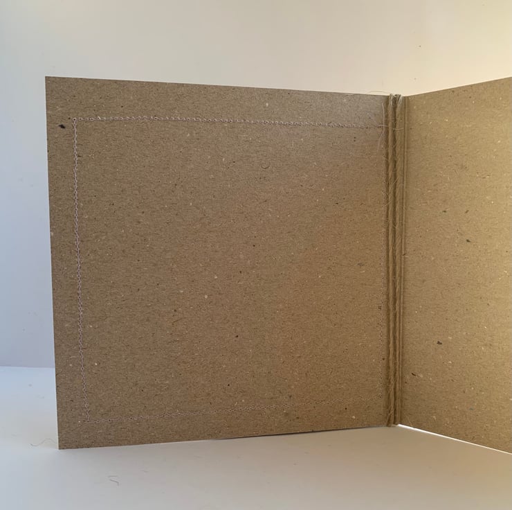 The hessian is machine stitched, using a contrasting thread, onto a plain brown recycled card. This stitching is visible on the inside of the card.