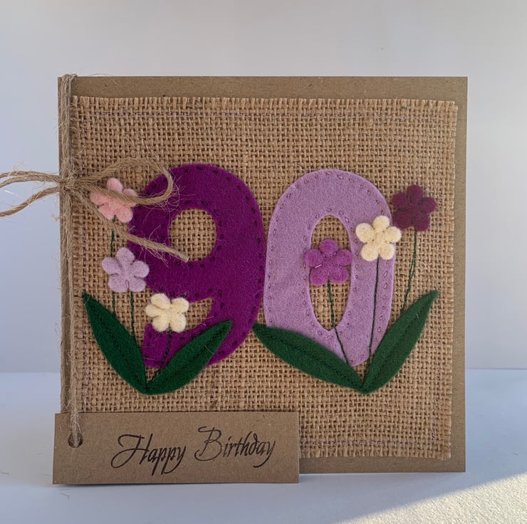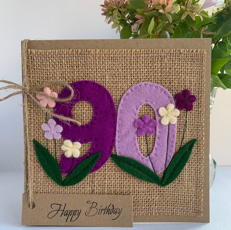 A unique handmade card for a special birthday. The numbers for this 90th birthday are hand cut from lilac and purple acrylic felt and hand sewn to a hessian background. Flowers, hand cut from wool felt, in pale pink, lilac, purple and cream are added to decorate the card.