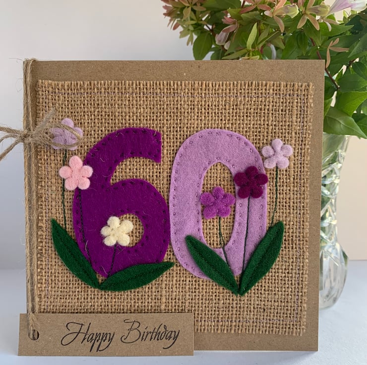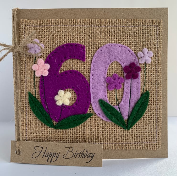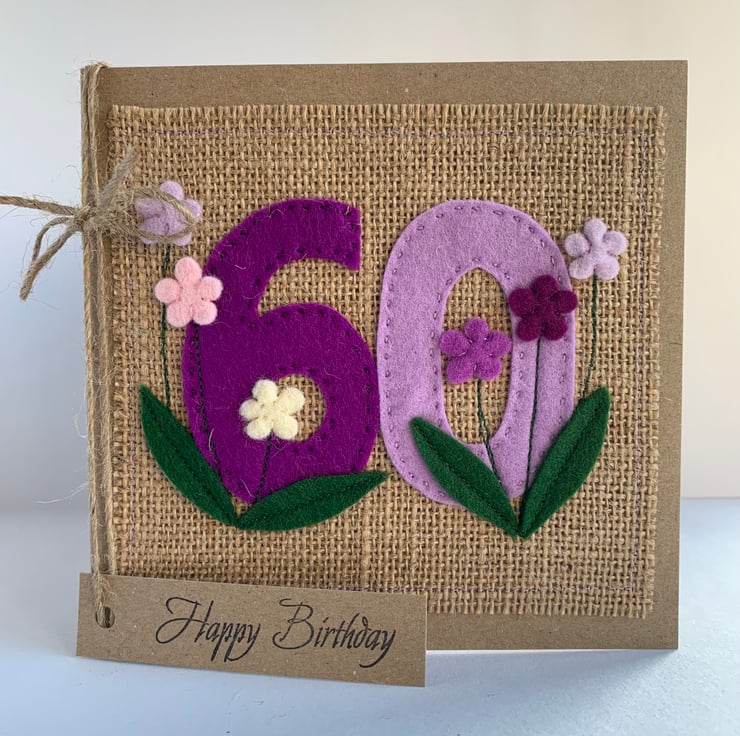A unique handmade card for a special birthday. The numbers for this 60th birthday card are hand cut from lilac and purple acrylic felt and hand sewn to a hessian background. Flowers, hand cut from wool felt, in lilac, purple and cream are added to decorate the card.