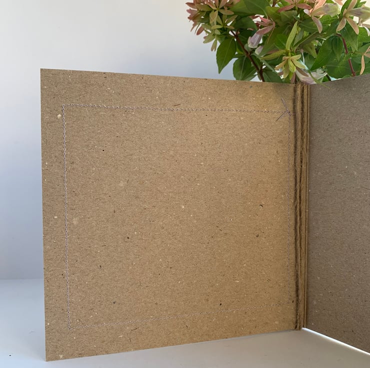 The hessian is machine stitched, using a contrasting thread, onto a plain brown recycled card. This stitching is visible on the inside of the card.