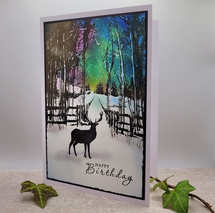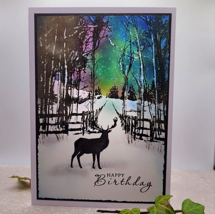 A beautiful one of a kind, hand-made Birthday Card with a stag and featuring the northern lights. This individually handcrafted layered card is suitable for everyone and measures 12.5 x 17.5 cms. It is blank inside for writing a personal greeting or message.