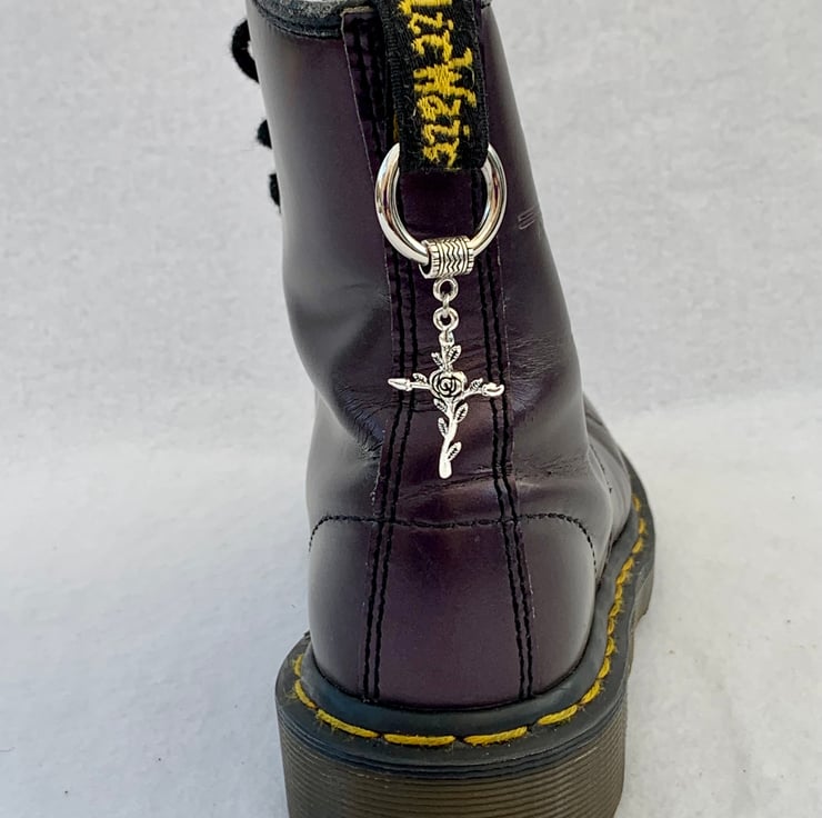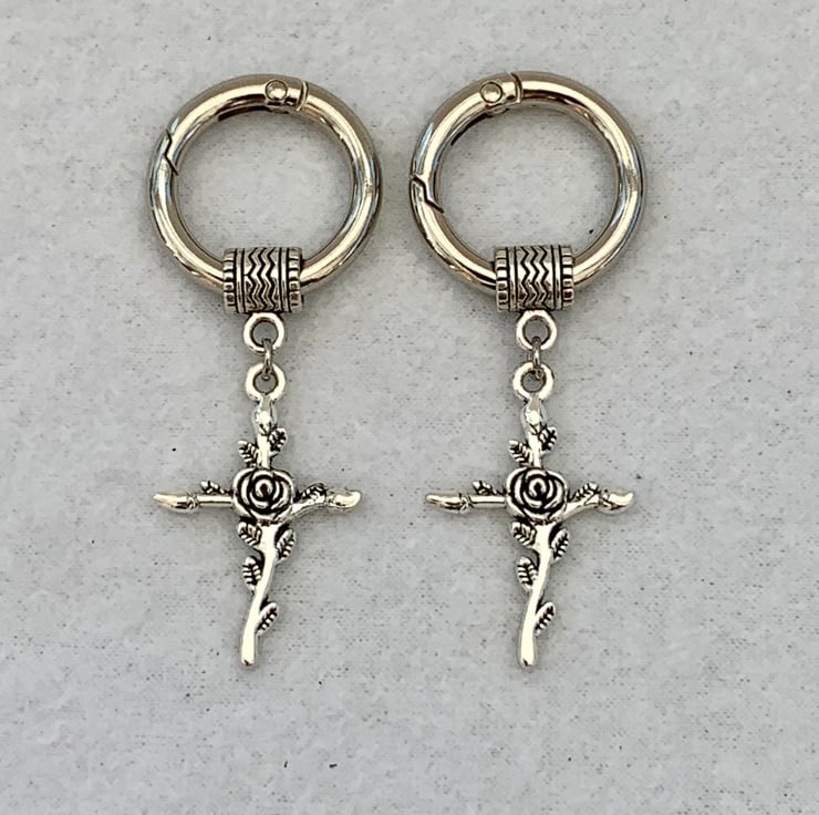 Alloy cross with a rose pendant measuring 35 x 24 x 3mm fitted with a stainless steel jump ring (for strength and longevity) onto a decorative alloy pendant bail and hung from a platinum coloured zinc alloy spring O Rings measuring approximately 27mm outer diameter, 4mm thick with a 20mm inner diameter.