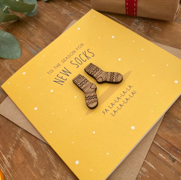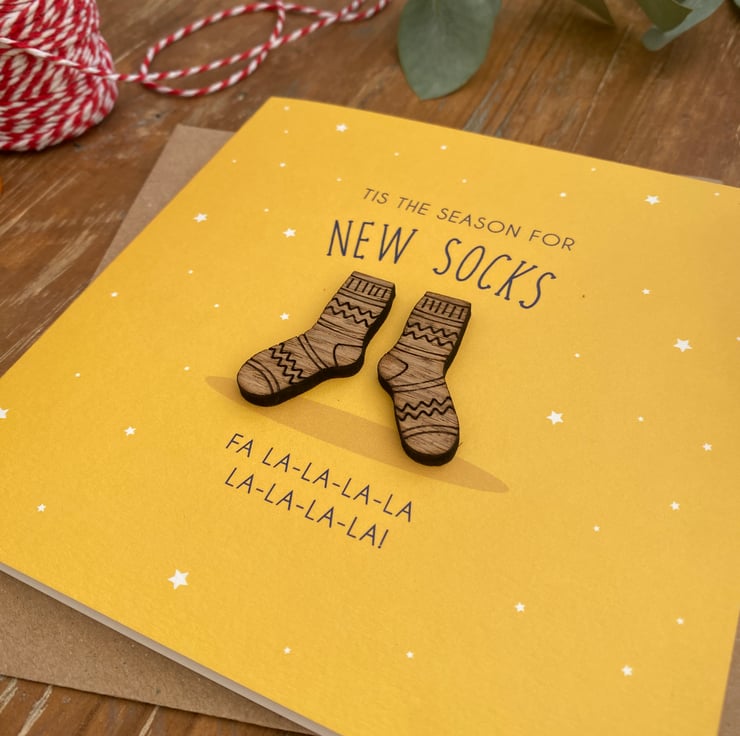 We all know Christmas is the time for New Socks, it's bound to be a joke in mosts households. Send this witty sock theme card detailed with two little wooden socks and the pun 'tis the season for new socks'. You'll be sure to put a smile on the recipients face.