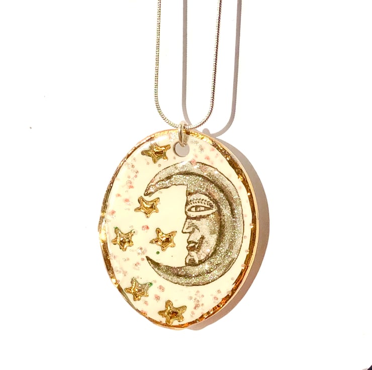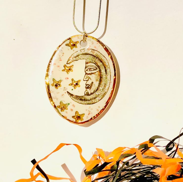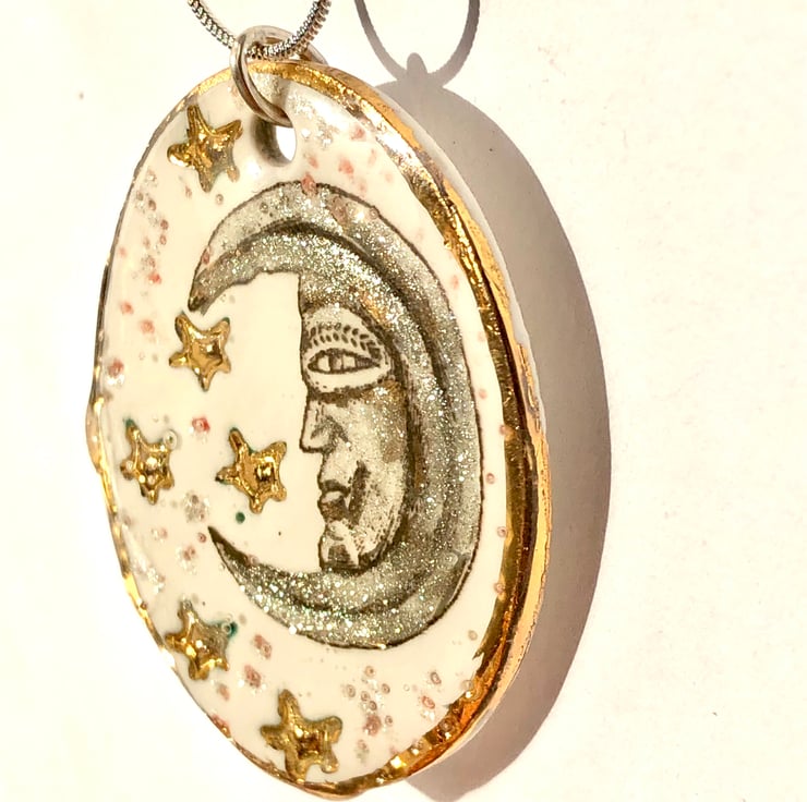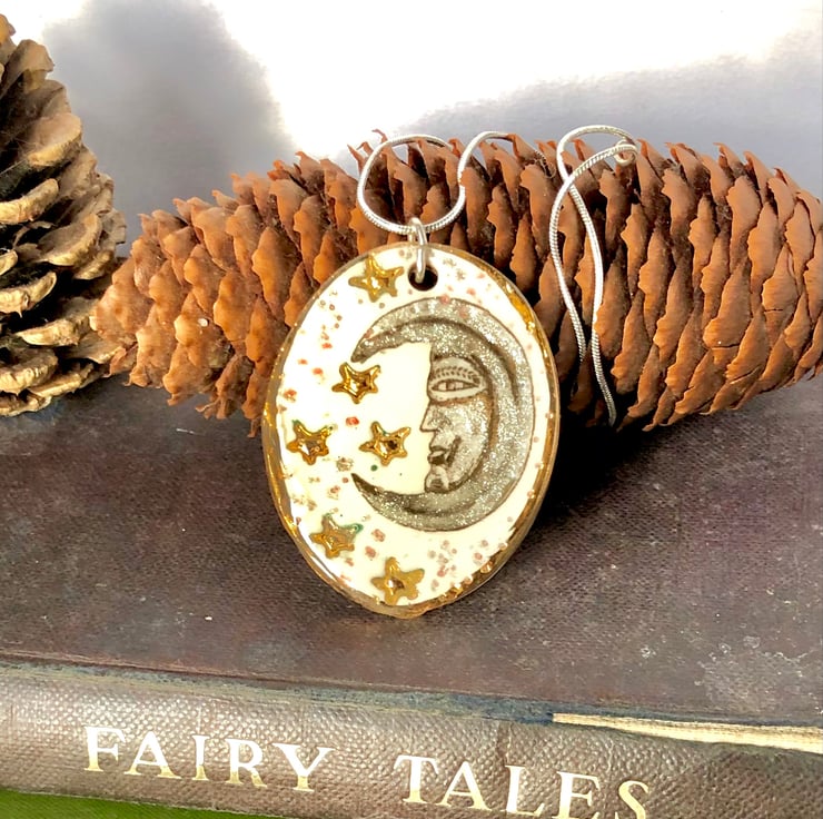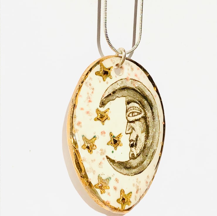 Vegan porcelain pendant handcrafted, hand painted in beautiful and Magical North Wales. All my work is hand made from vegan porcelain clay , painted and fired in my kiln up to five times for 12 hours to seal each layer of paint, real 22 carat gold lustre and resins for extra strength. All totally unique. Come on a silver plated snake necklace and gift boxed.