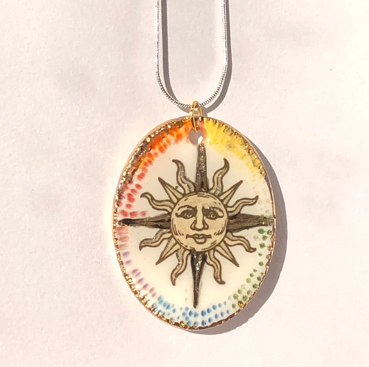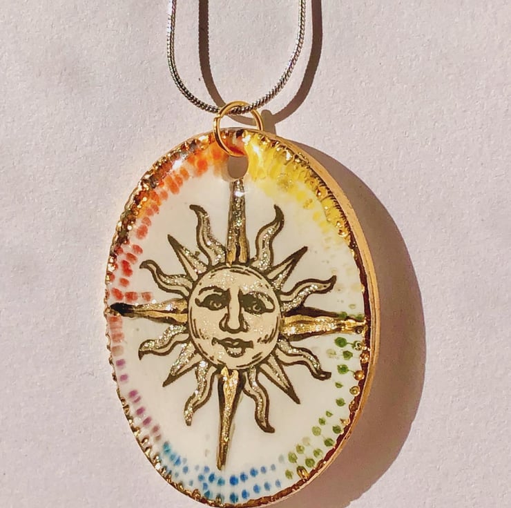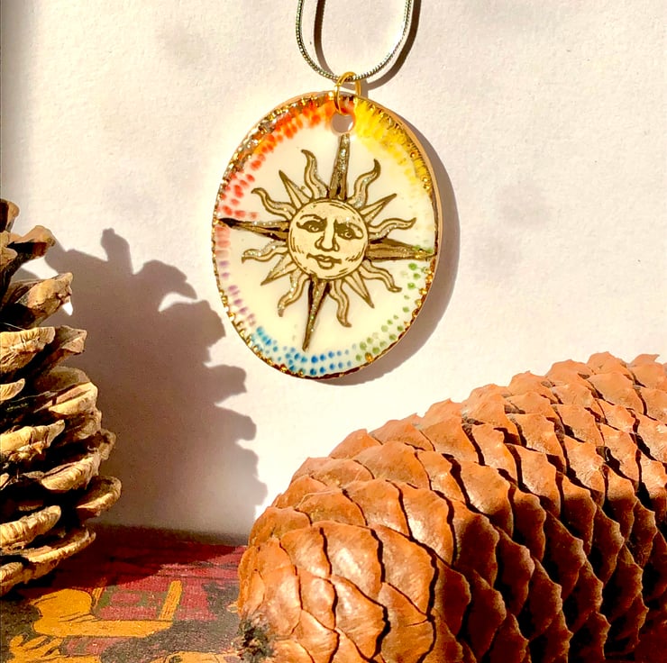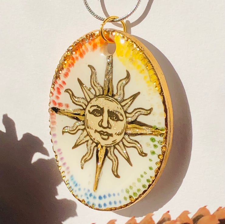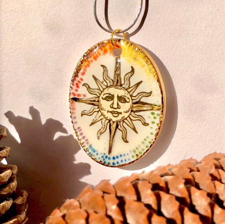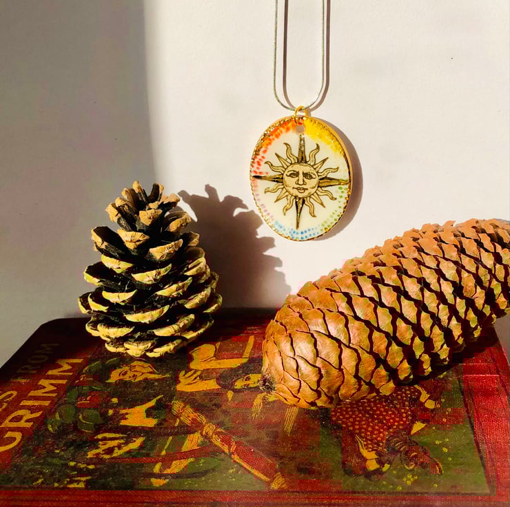 Vegan porcelain pendant handcrafted, hand painted in beautiful and Magical North Wales. All my work is hand made from vegan porcelain clay , painted and fired in my kiln up to five times for 12 hours to seal each layer of paint, real 22 carat gold lustre and resins for extra strength. All totally unique. Come on a silver plated snake necklace and gift boxed.
