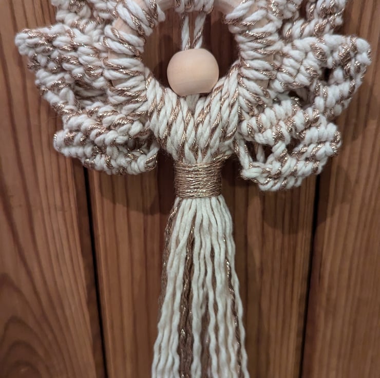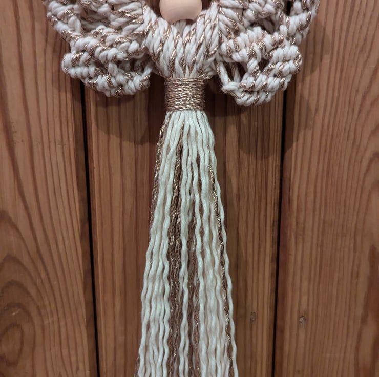 This beautiful handmade macrame angel is made from a gorgeous blend of cream and gold macrame cord and is perfect as a Christmas decoration either on a wall or tree.