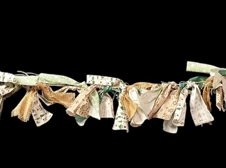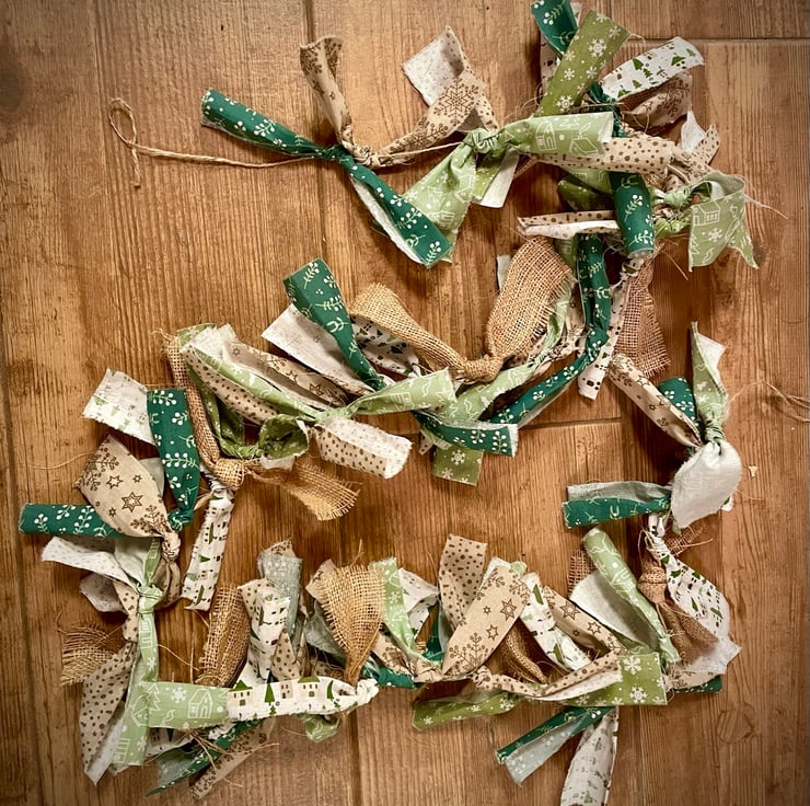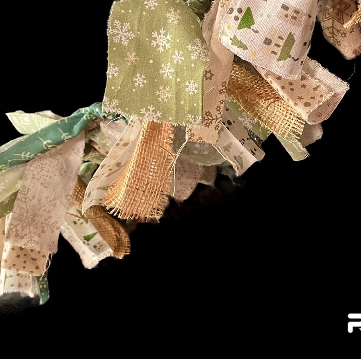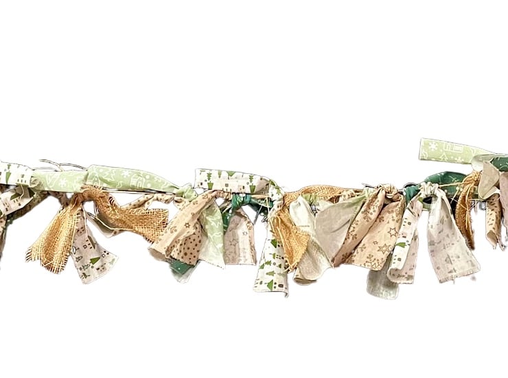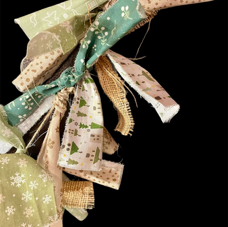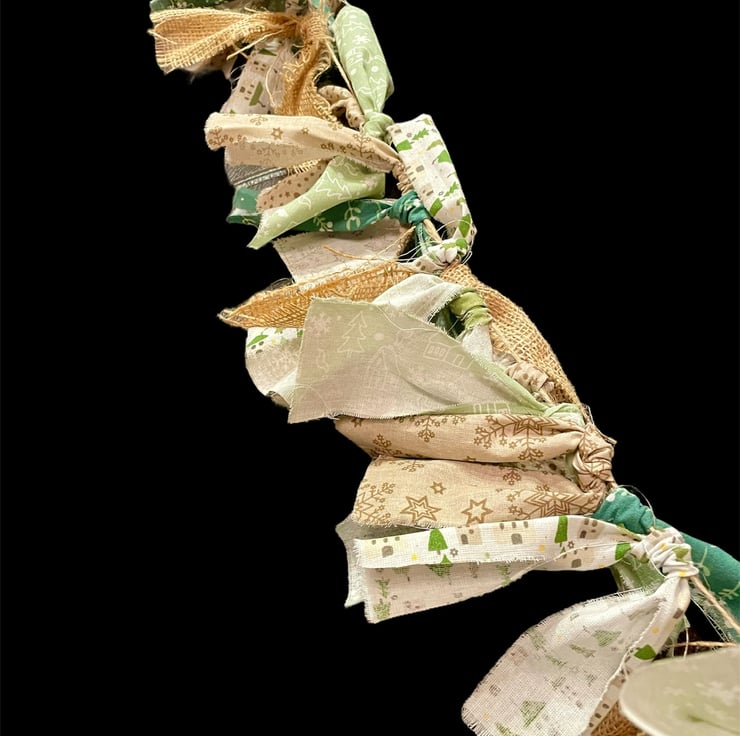 This “Folksy” Christmas Bunting gives a farmhouse rustic feel to your Christmas decorations. This boho garland measures 2 m long with its muted green and brown Christmas fabrics and burlap strips.