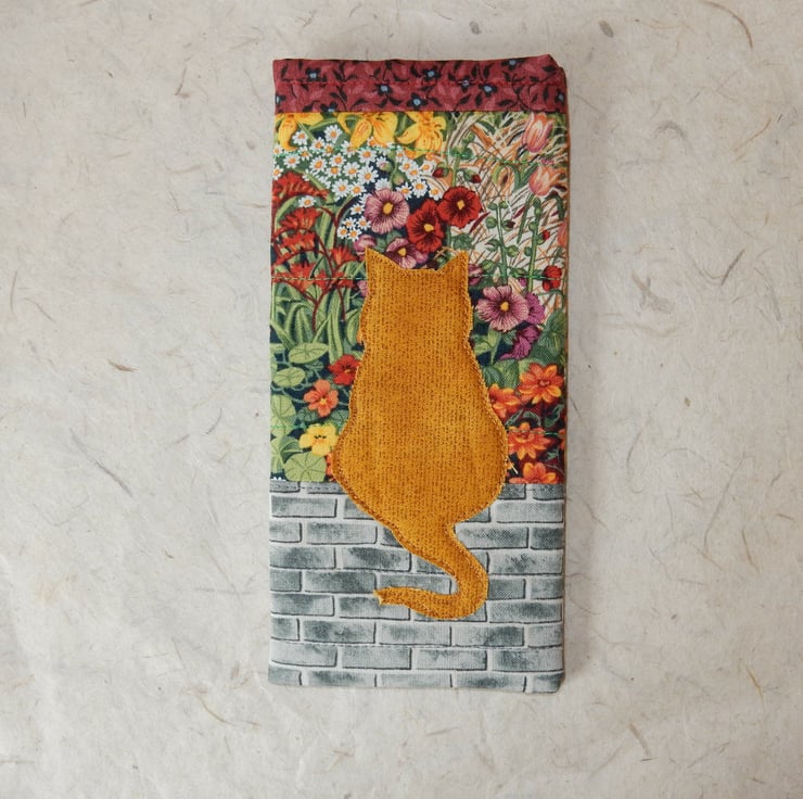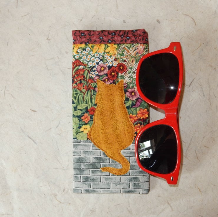A ginger cat is sitting on a wall and looking at the pretty flowers on this slip -in -style glasses case. There is a toning floral trim and lining. It is made from cotton print fabrics, the cat has been appliqued on, and it has a firm layer of wadding to protect your glasses or sunglasses. This is a slip in style glasses case, if you require a case which fastens please view my other listings.