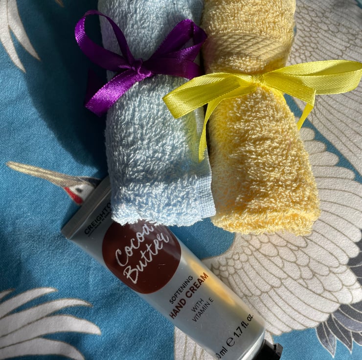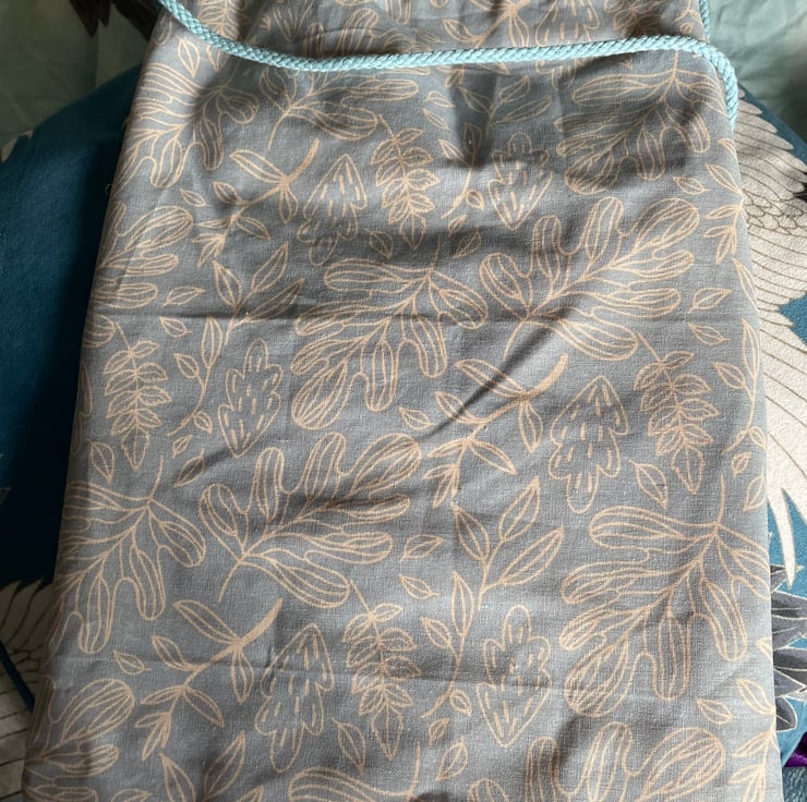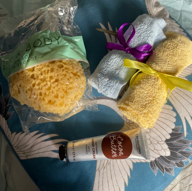Handmade using cotton fabric fully lined with waterproof fabric, with braided cord drawstring closure. The wash bag contains -