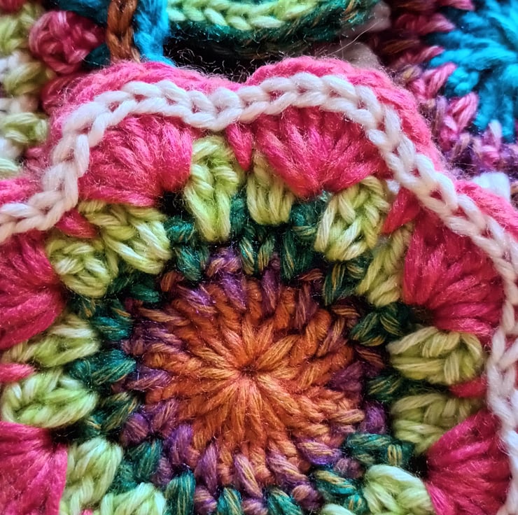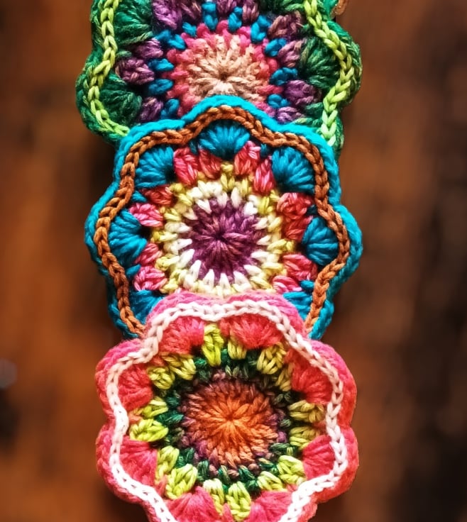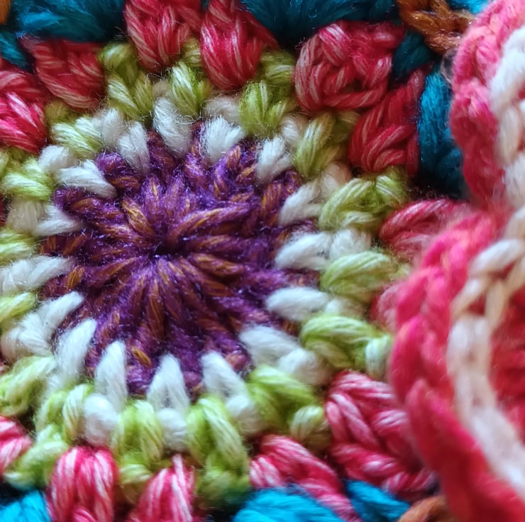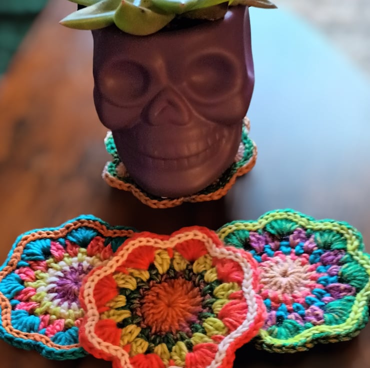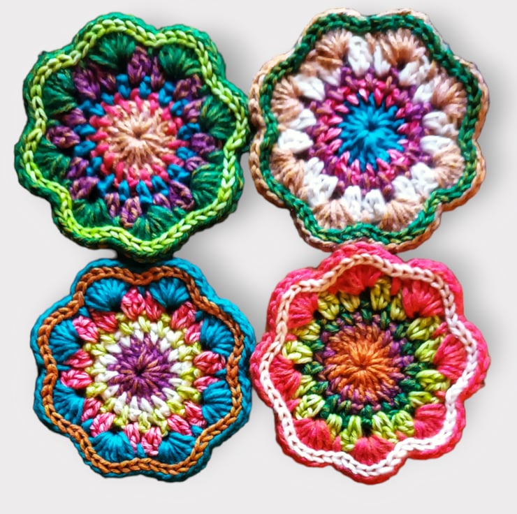 Finish off your table with this set of 4 colourful mandala flower coasters, handmade on the west coast of Scotland. Add a touch of colour to your winter table. Your glasses will not stick to them like wood or plastic. Lovingly crocheted in cotton. 8.5 cm diameter.