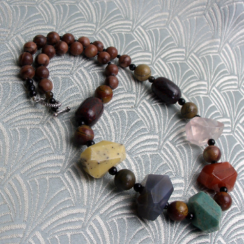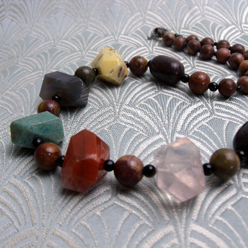 This short chunky handmade necklace has been created from a set of chunky semi-precious stone nuggets set in a chunky gemstone necklace of jasper beads.