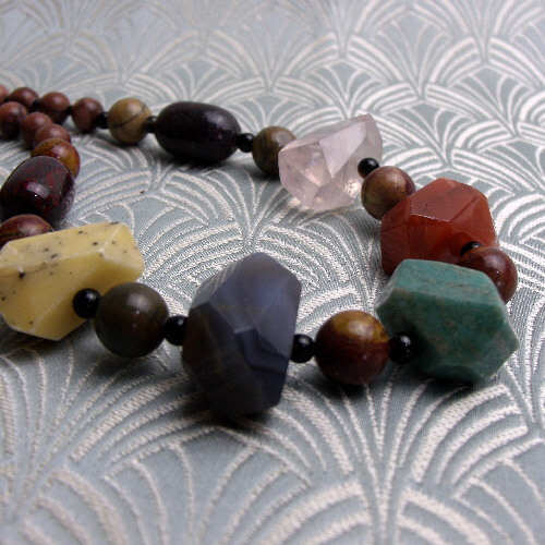 I have spaced these chunky semi-precious gemstone nuggets with round jasper beads and this unique short chunky handmade necklace design finishes with round jasper beads.