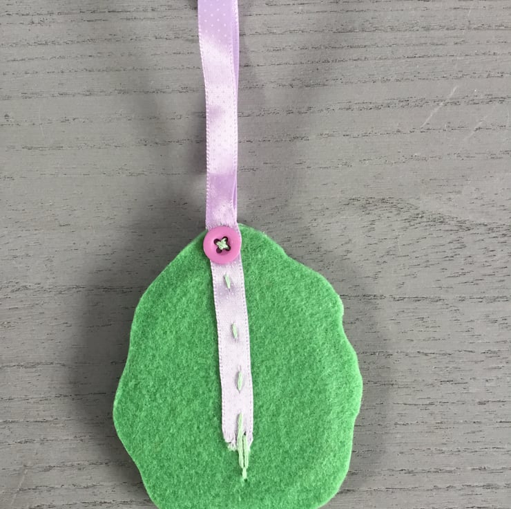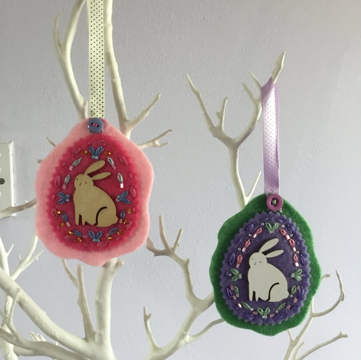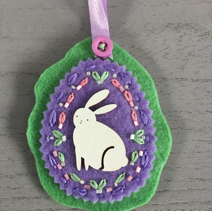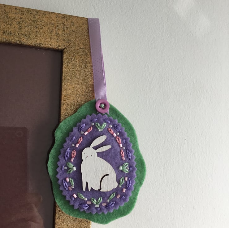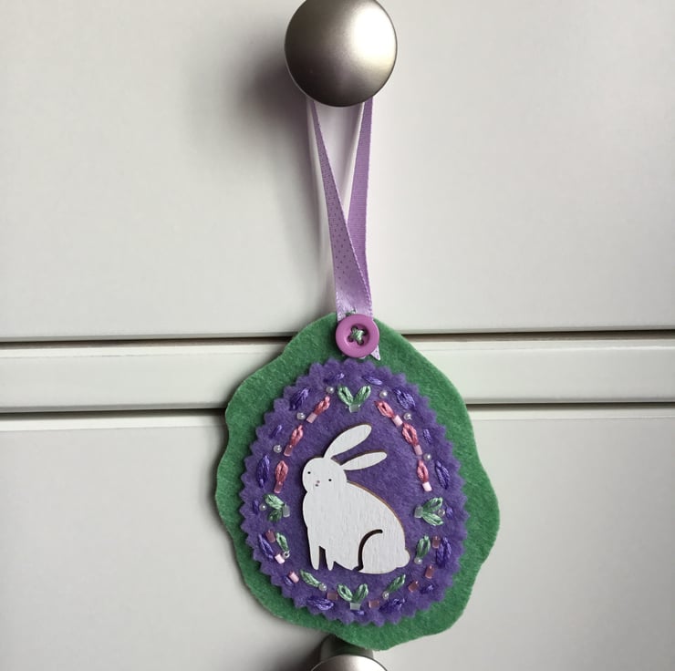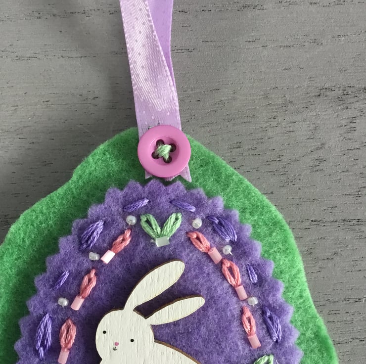 This Hand Embroidered Lavender Rabbit Decoration has a wooden white Rabbit sitting on ovals of lavender and green felt. She is surrounded by hand embroidered Lazy-Daisy and Running Stitches in pale green, pink and lilac embroidery thread, dotted with white, pale green and pink seed beads. A long lilac hanging ribbon, stitched with small pink buttons front and back is at the top. So this Hand Embroidered Lavender Rabbit Decoration is ready to hang up in the home...... on the wall, over a picture frame or drawer handle, in a nursery or child’s bedroom, on a pram or a crib.