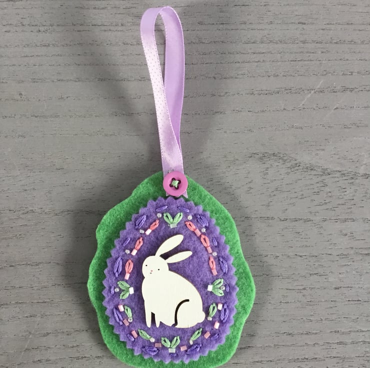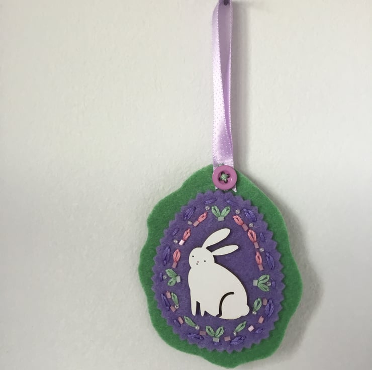 This Hand Embroidered Lavender Rabbit Decoration is 4 by 3.50 inches with a 3 inch hanging loop.