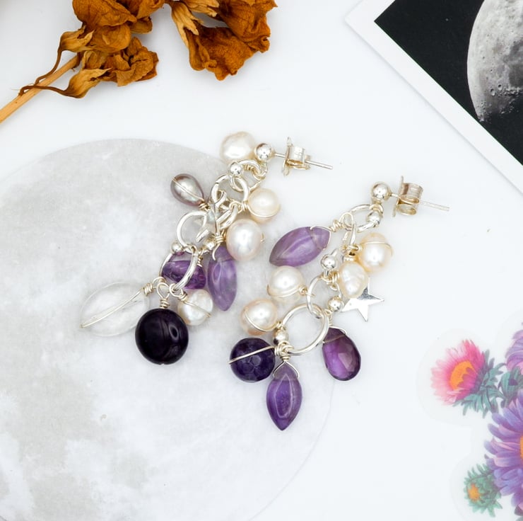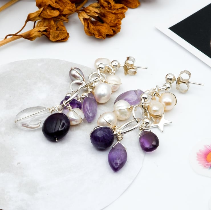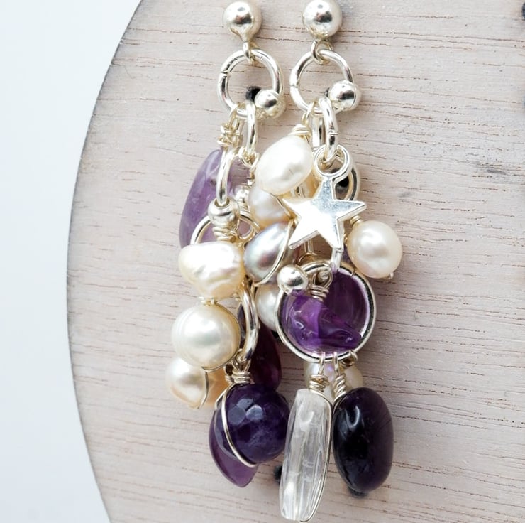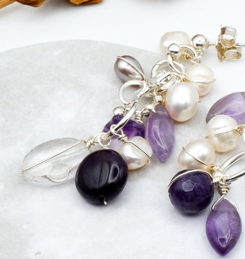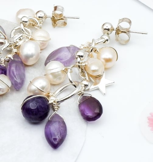 Handmade right here in the East Midlands, these earrings mix genuine Amethyst gemstones, freshwater pearls, and sterling silver components.