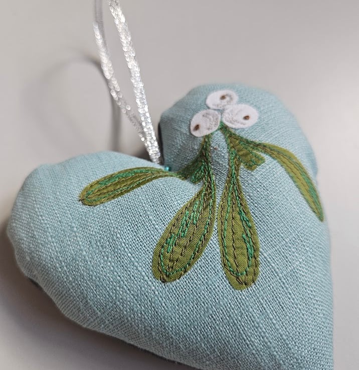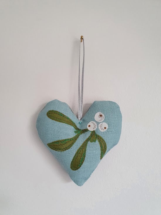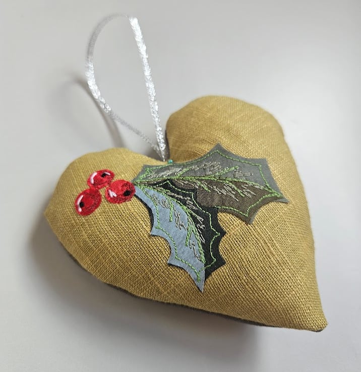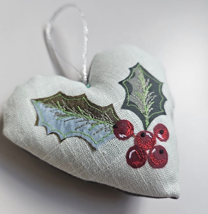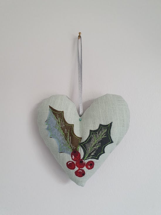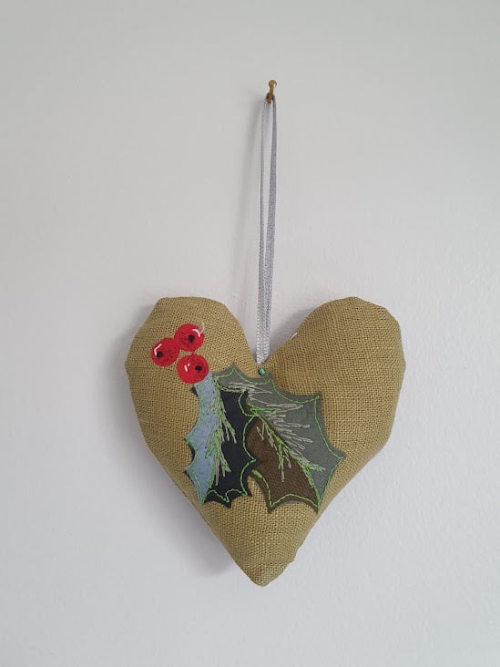 Handmade Christmas decorations, padded hanging heart, Holly, mistletoe, berries