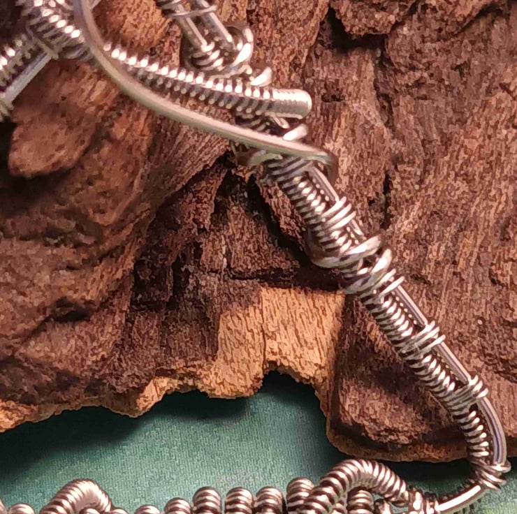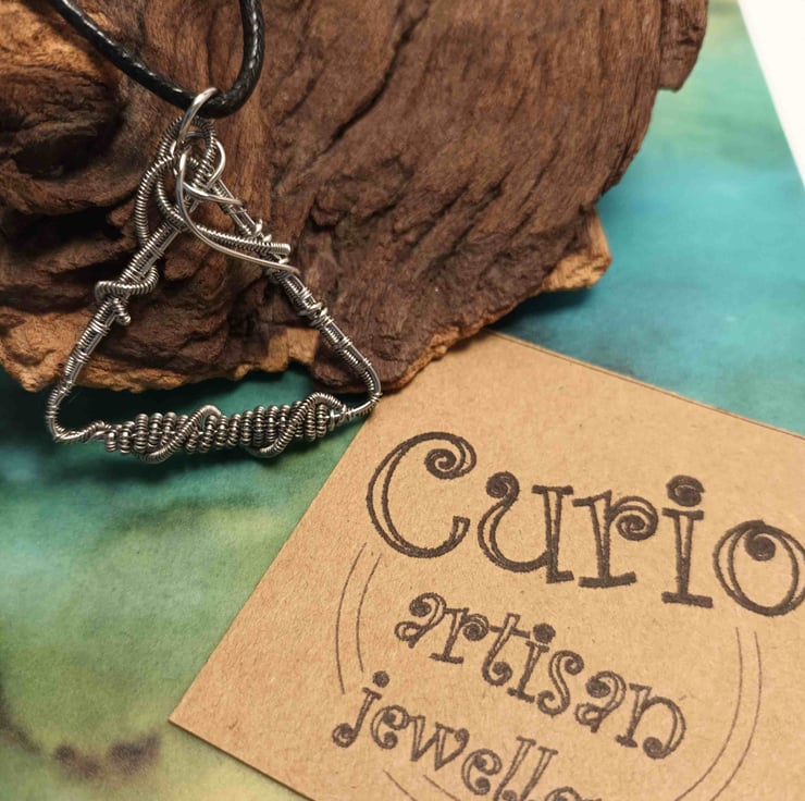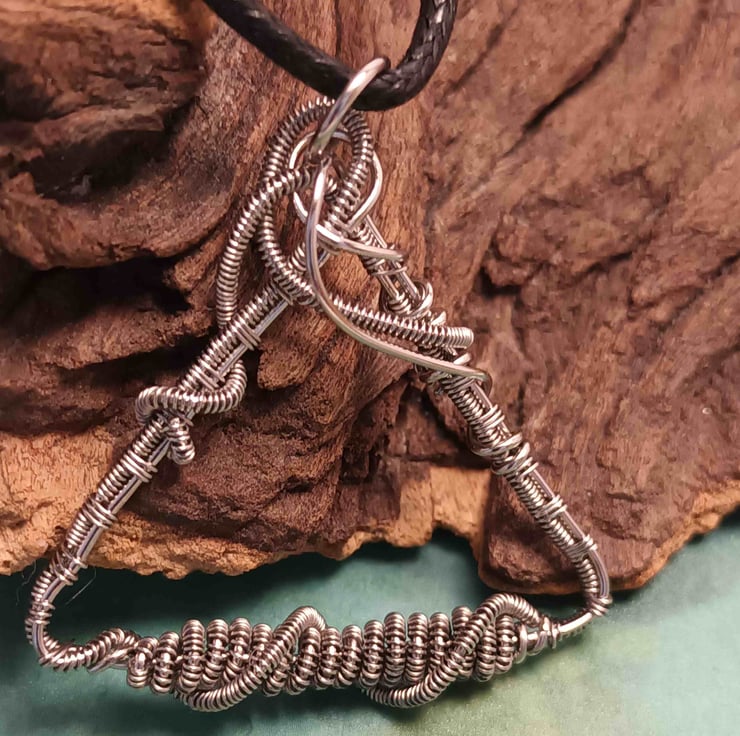The stainless steel wire weaving, flourishes & coiling creates a stunning triangular pendant for evening or day wear.