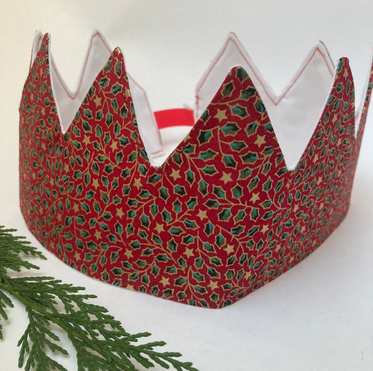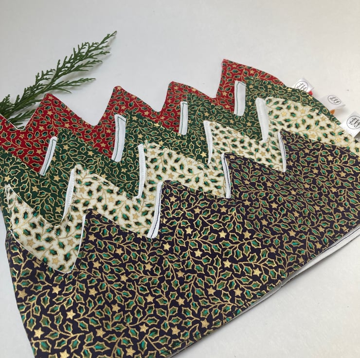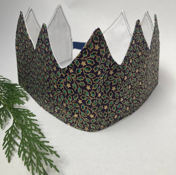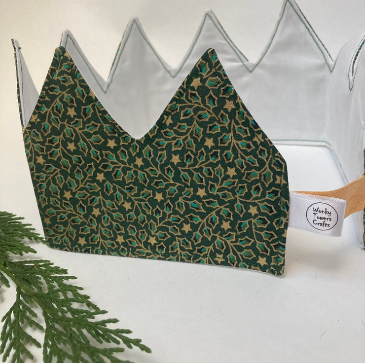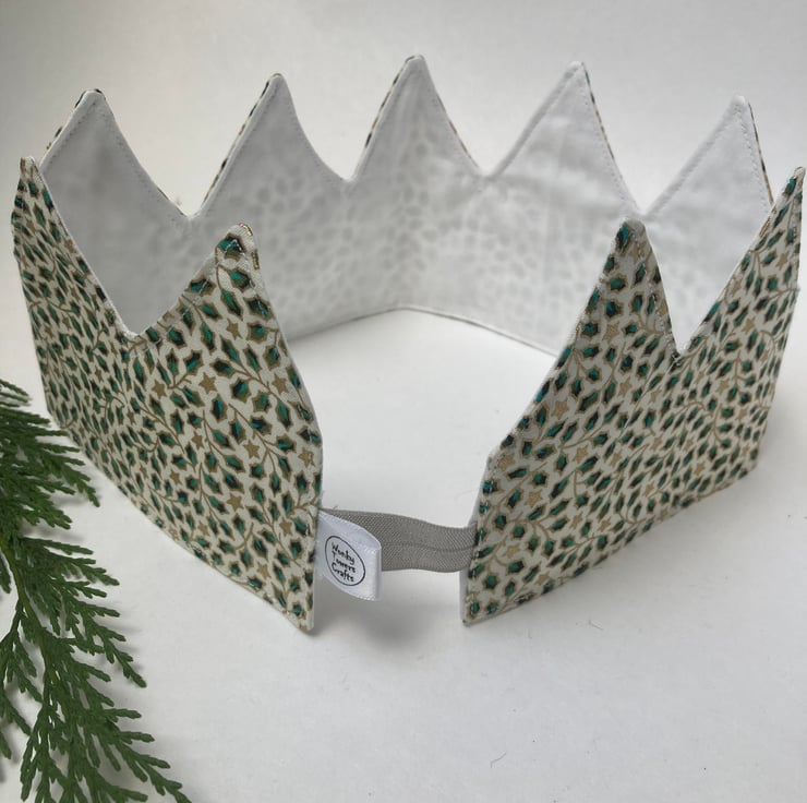 If you're trying to live more sustainably, little changes can make all the difference. These beautiful crowns are made from some beautiful Christmassy cotton fabric in four different colour ways. The fabrics are red, green, white and blue and are decorated with a gold and green holly design. They are strengthened with a soft interfacing and lined with plain cotton. They are fitted with a short length of soft elastic in a co-ordinating colour and will comfortably fit most adult head sizes. Alternatively you can choose a ribbon fastening.