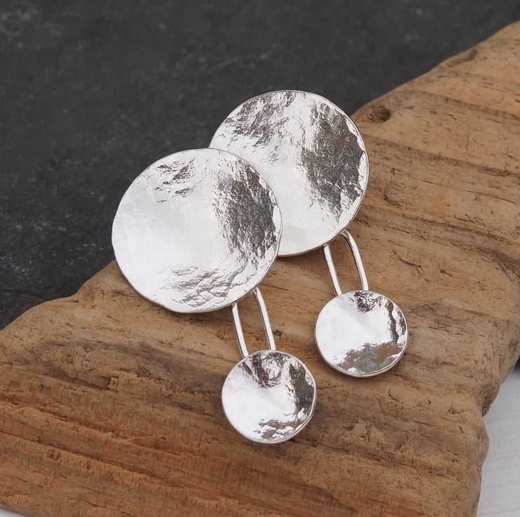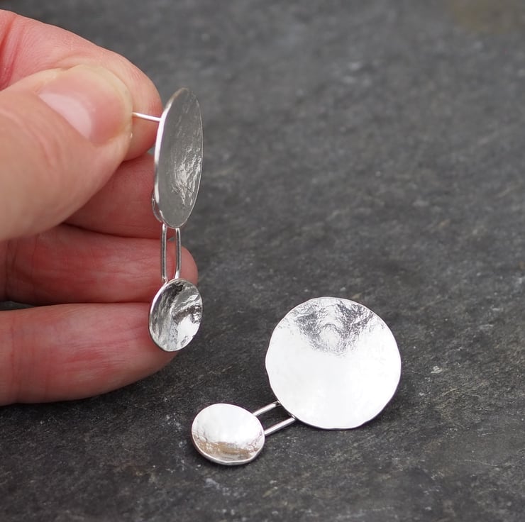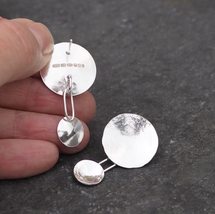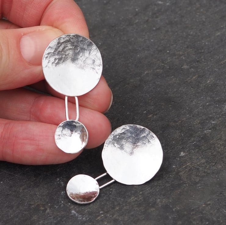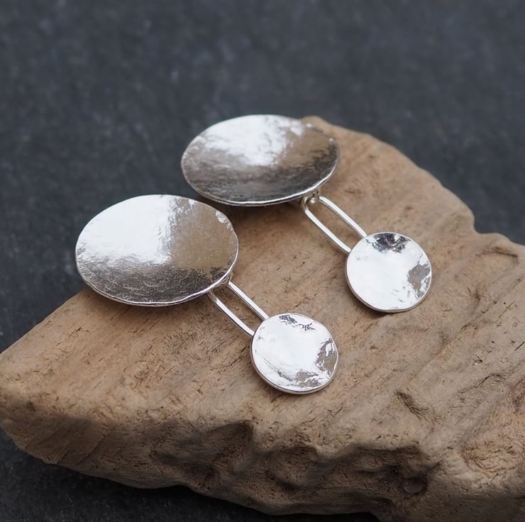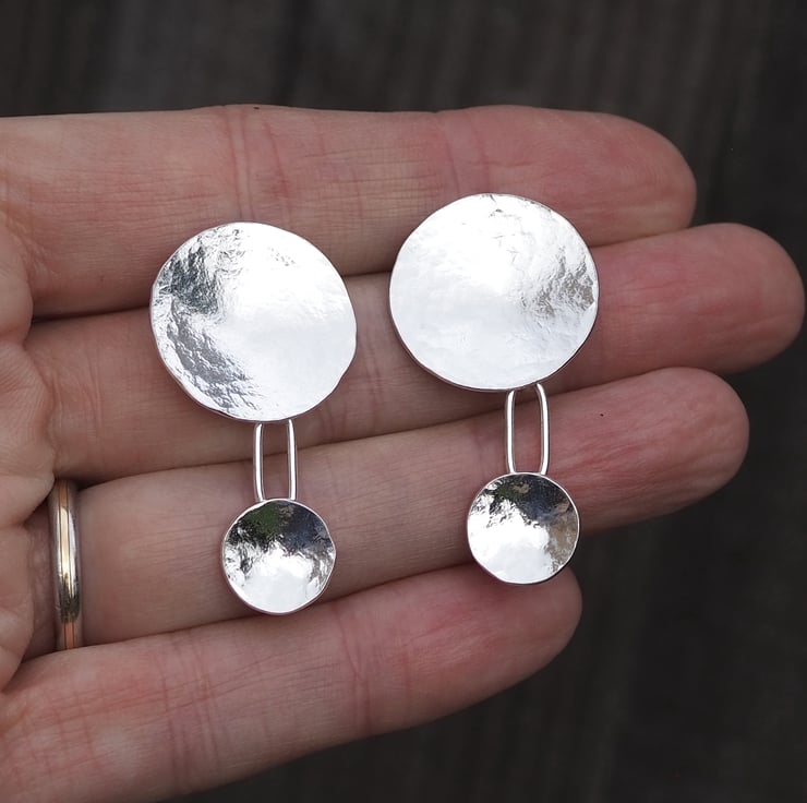 These large disc stud earrings feature a smaller disc that dangles beneath. The smaller disc swings freely from side to side, giving a lovely movement to the earrings. The silver has been textured with a vintage hammer and polished to a bright shine. Both discs are slightly domed to curve the disc.