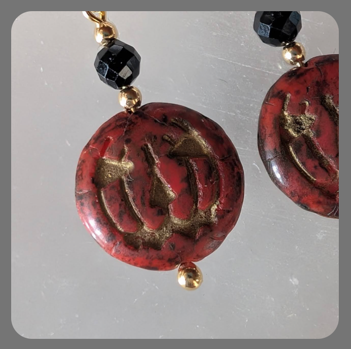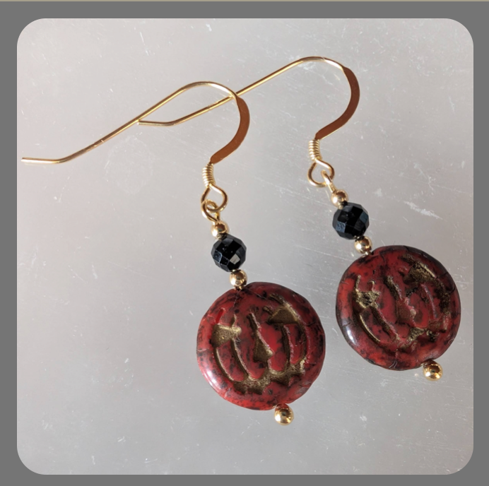 Halloween Pumpkin Czech Glass, Garnet and Vermeil (gold plated sterling silver) Earrings.
