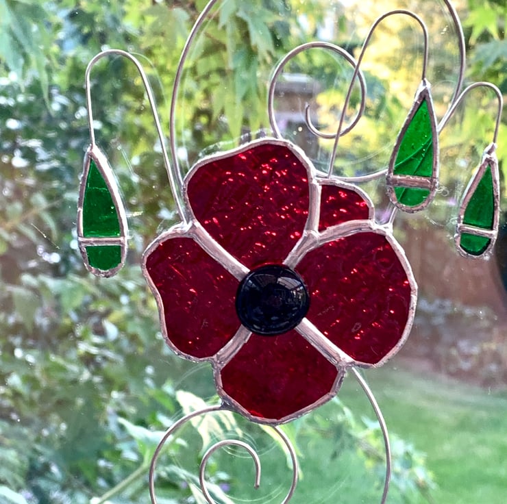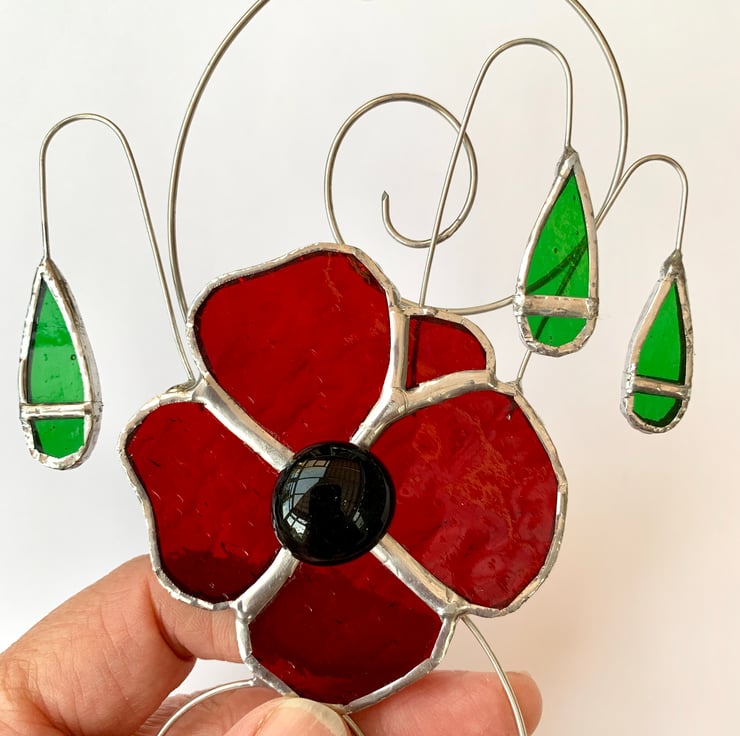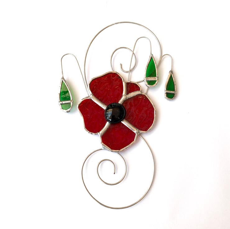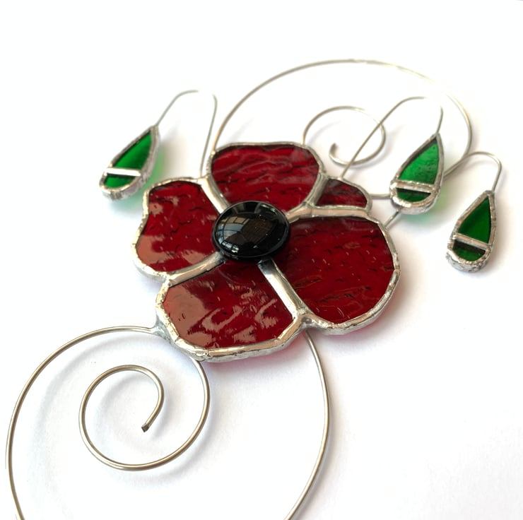 This has been made from a beautiful red sea glass with a black glass nugget stuck in the middle. Green wissmach glass has been used for the poppy heads.