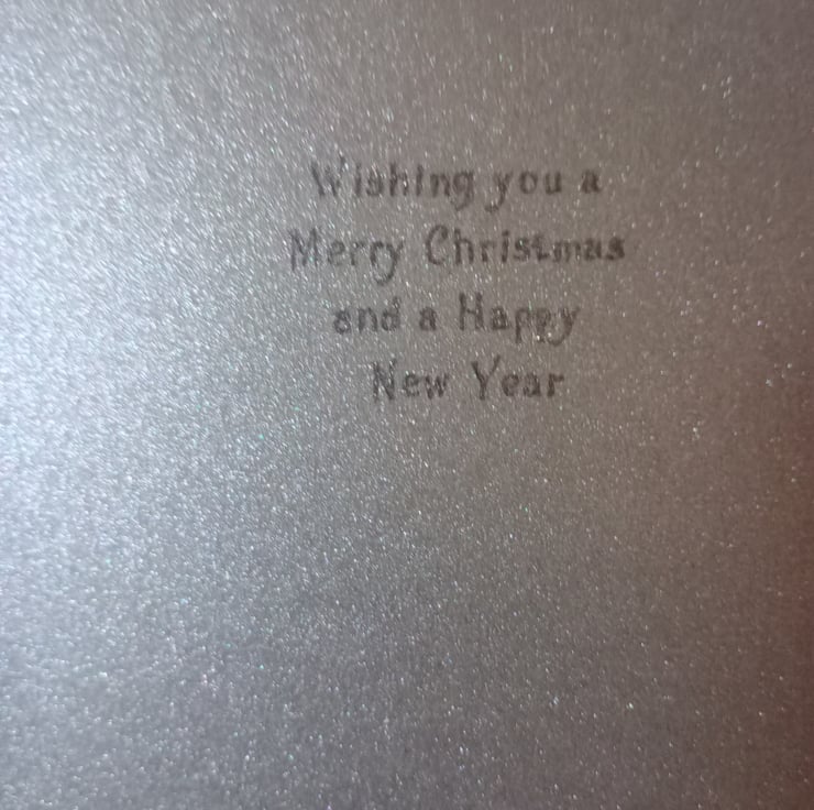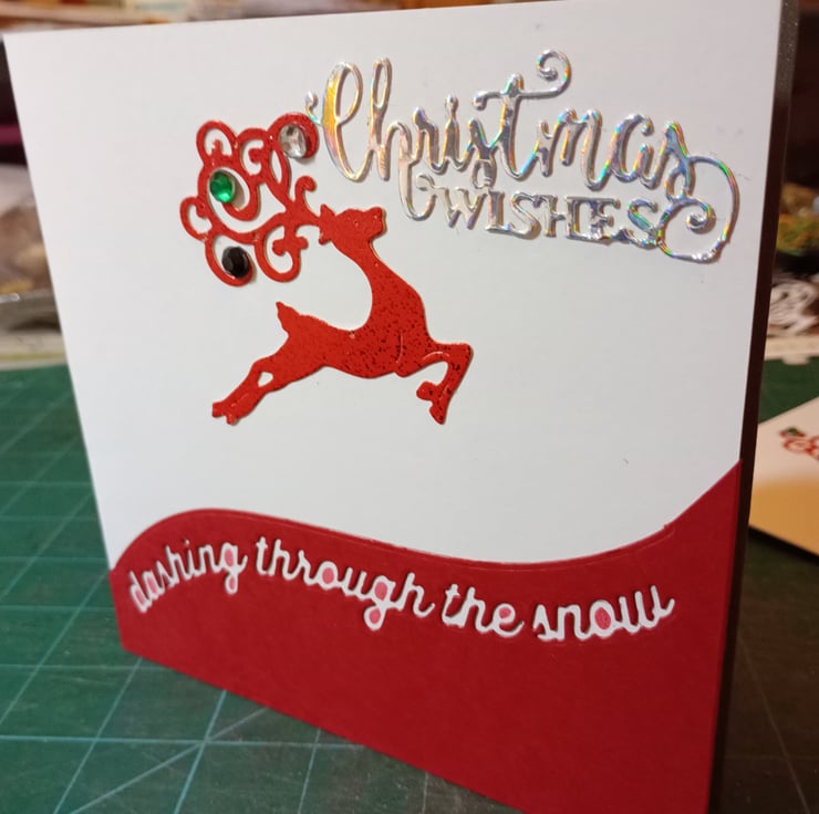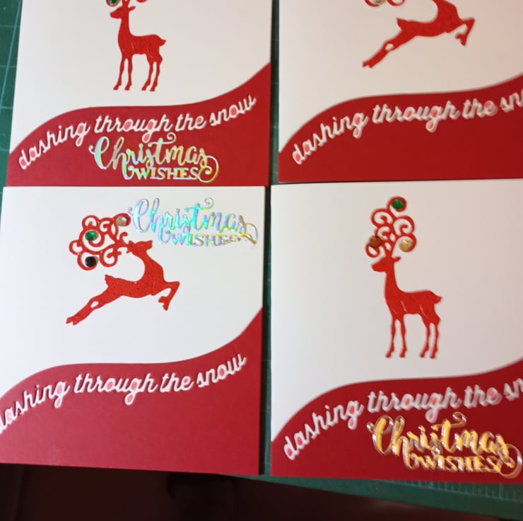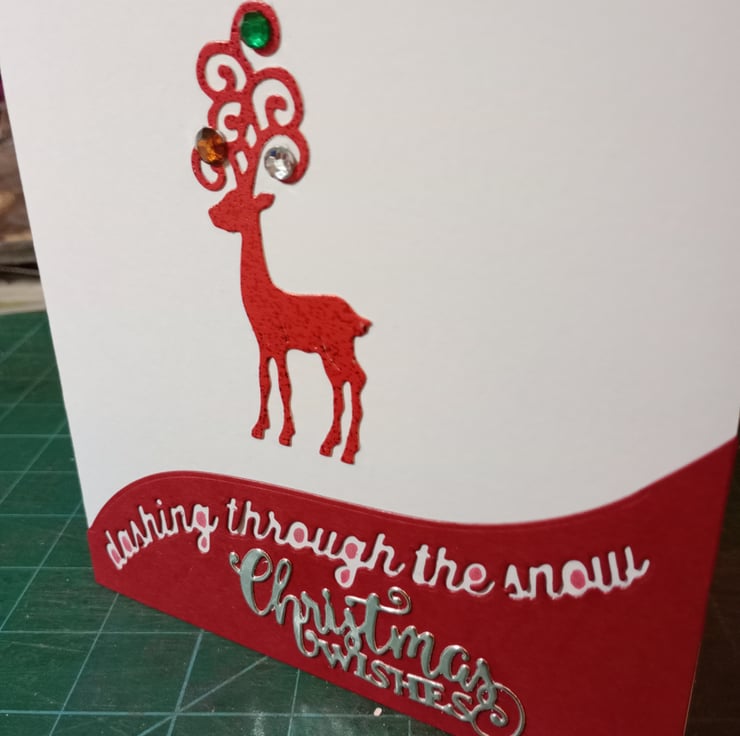 A pack of 4 Christmas cards. Handmade and uniquely designed. Consisting of two different designs. Two of each. Reindeer die cut from red sparkle card mounted onto pristine white quality card. Antlers decorated with rhinestones. Base of each card with dashing through the snow and festive Christmas wishes