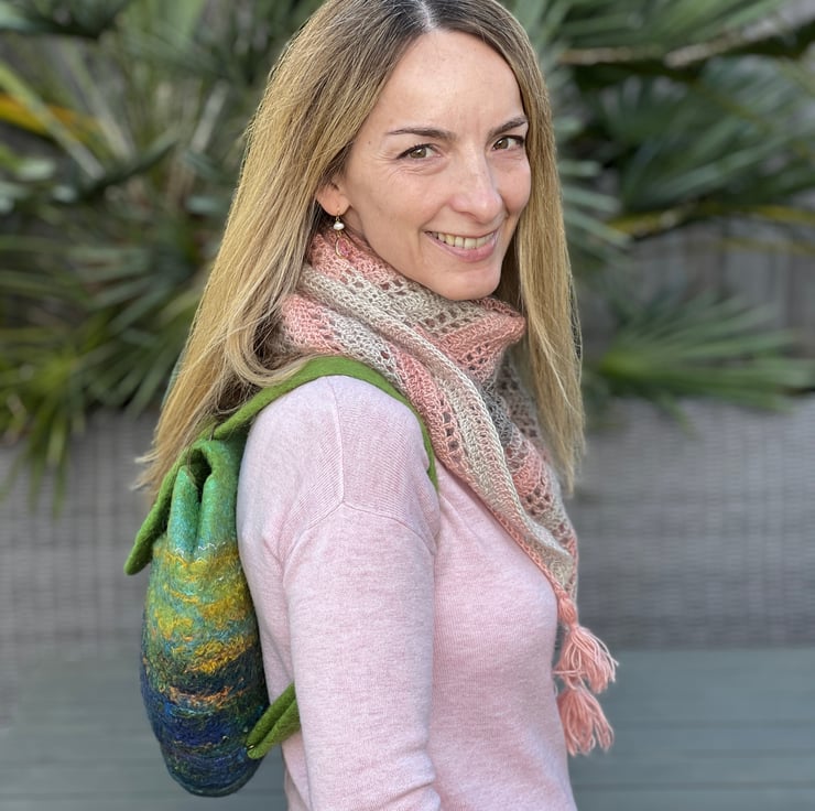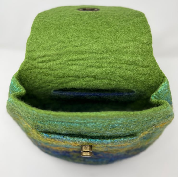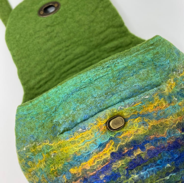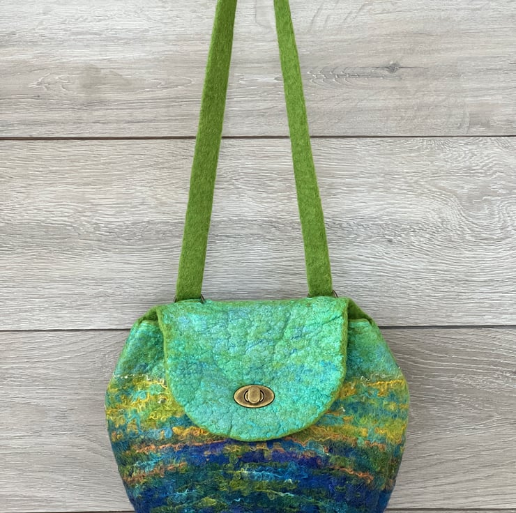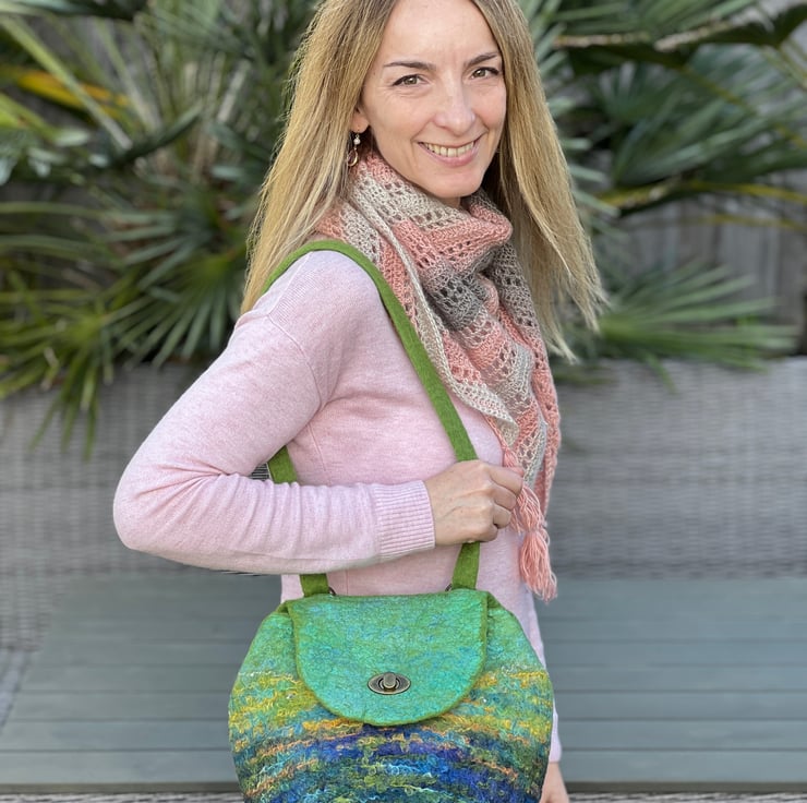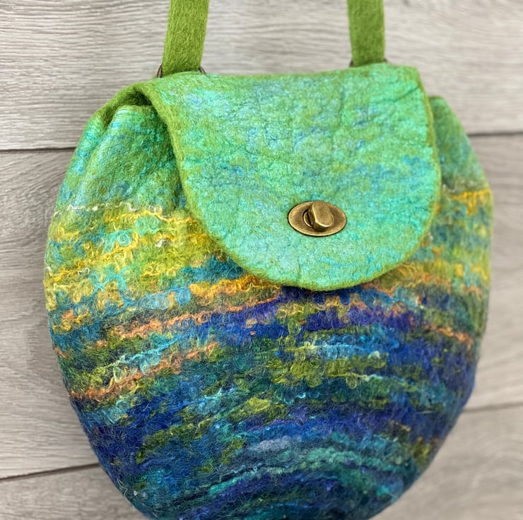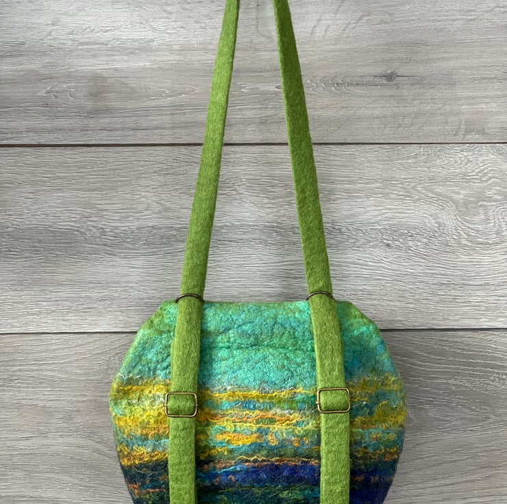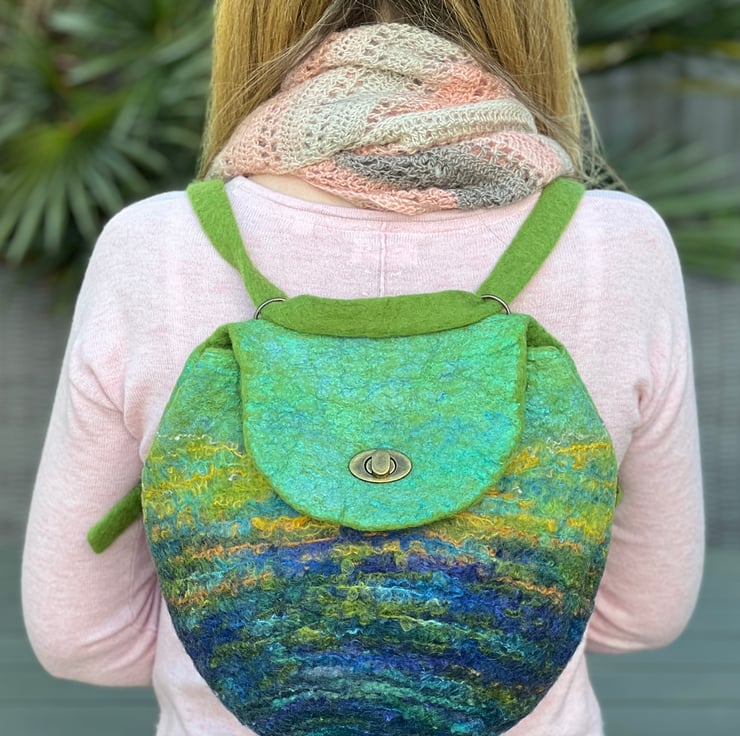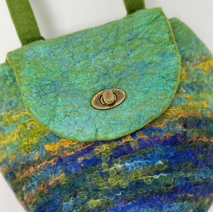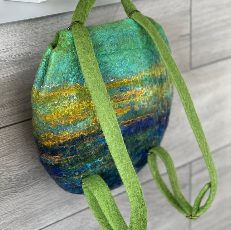 This large felt backpack has been hand-felted by me using a felting ball. The felt has been made using green and blue wool fibre along with silk fibres (creating a silky sheen at the top of the bag and flap) and wool yarns to create an overall landscape-style design/pattern.