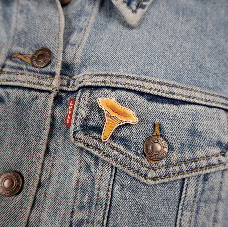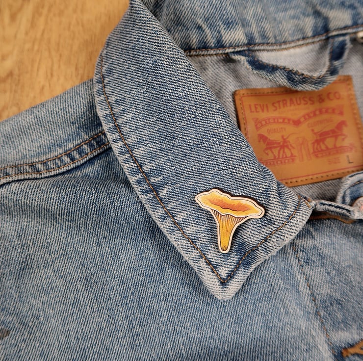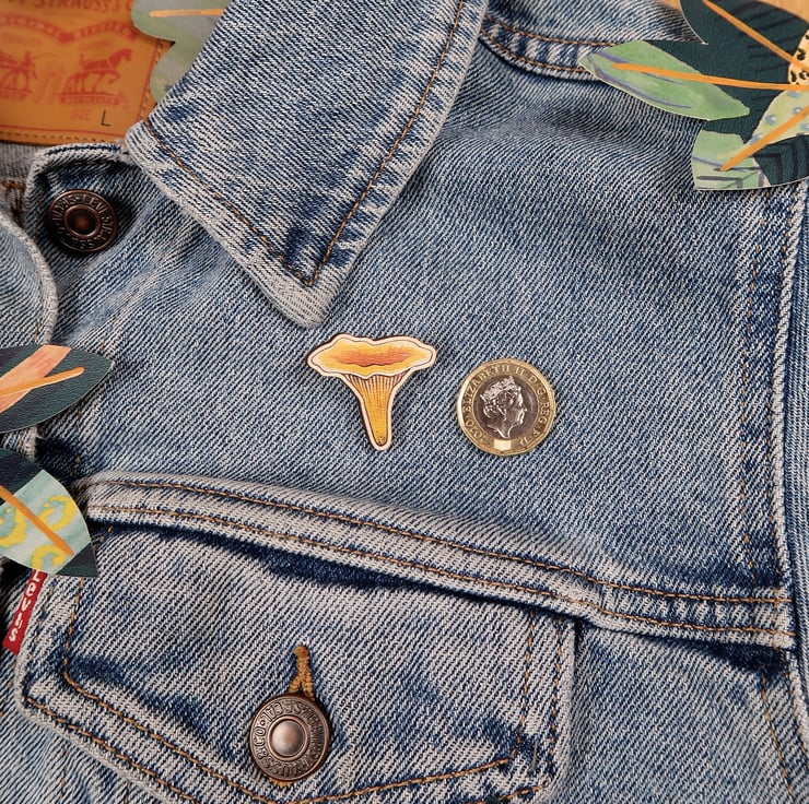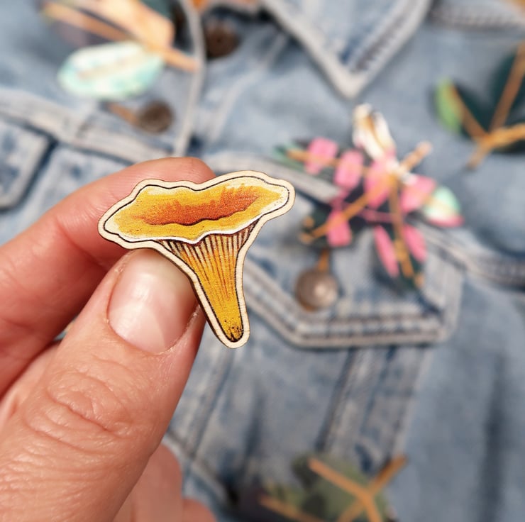 Beautiful wooden CHANTERELLE pin badge.