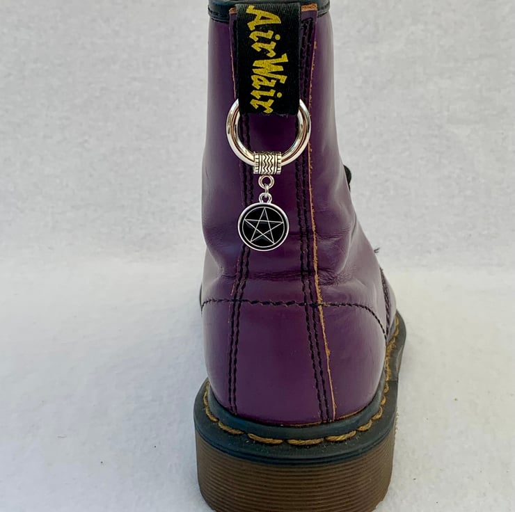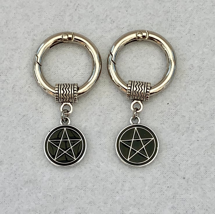 Alloy enamel pentagram pendant in black and silver tone measuring 20 x 17 x 1mm fitted with a stainless steel jump ring (for strength and longevity) onto a decorative alloy pendant bail and hung from a platinum coloured zinc alloy spring O Rings measuring approximately 27mm outer diameter, 4mm thick with a 20mm inner diameter.