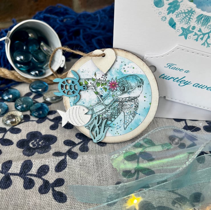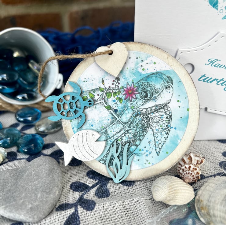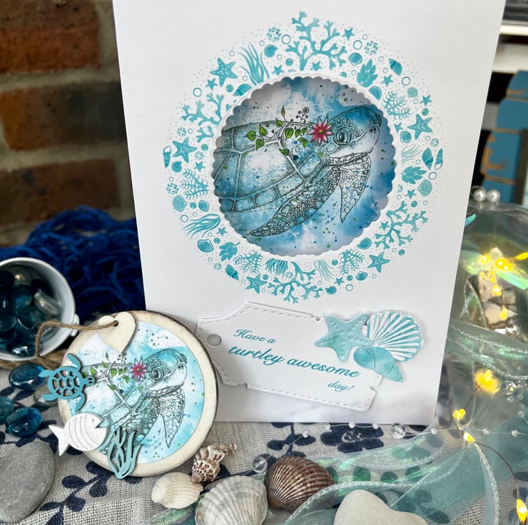 Birthday card & wooden craft decoration gift of an illustrated turtle. The front cover design is a colour print of my pen illustration featuring a sea turtle. I finished this piece off with a watercolour background to add a splash of colour. The image has been printed on a 120gsm ultra-bright silky paper insert and can be seen through a window cutout on 300gsm smooth finish white card. There is a 3D tag shape with the message ’Have a turtley awesome day’ on it. The card is A5 in size and measures approximately 21cmx14.8cm and includes a white envelope. The inside of the card has a plain white paper insert and is left blank for your message.