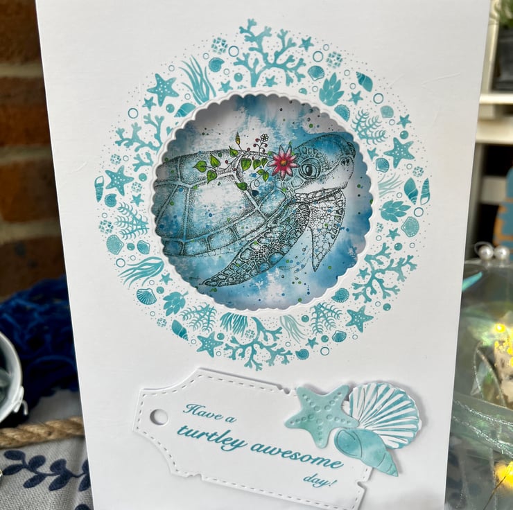 This design makes a lovely greeting card & can be kept as a print decoration around the home afterwards for any turtle fan.