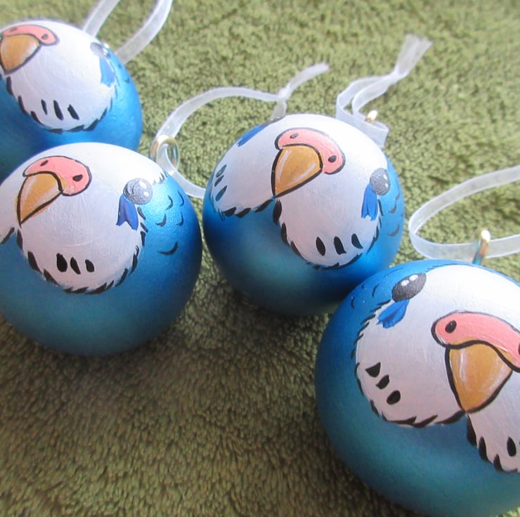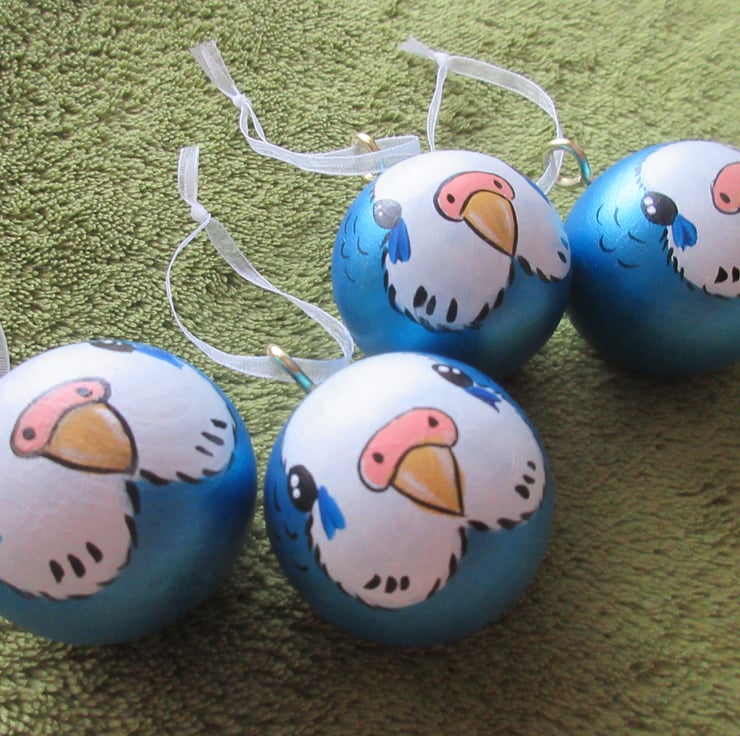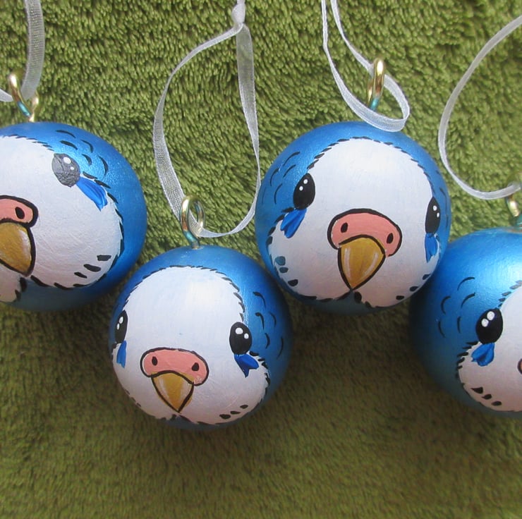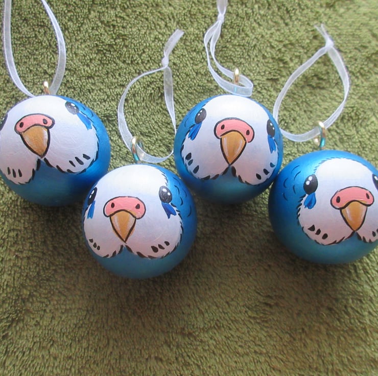 This is a set of four hand painted wooden budgie Christmas decorations.