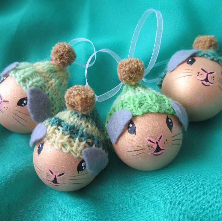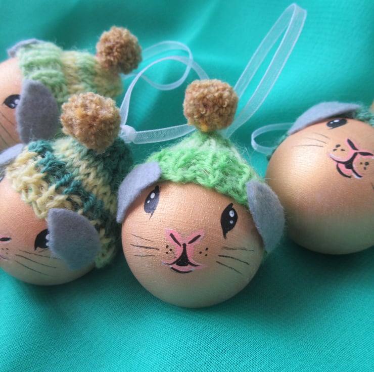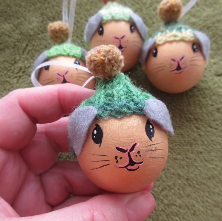 A set of four hand painted wooden baubles, painted to look like guinea pigs.