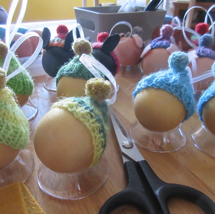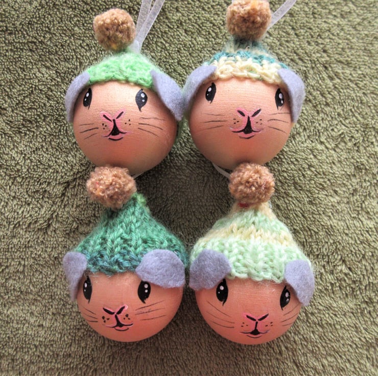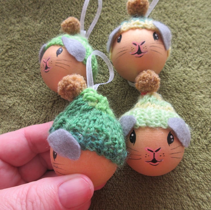 Each guinea pig is wearing a mini woolly hat, which has a loop of ribbon for hanging it by. The hats are each different, but in similar shades of green and yellow.