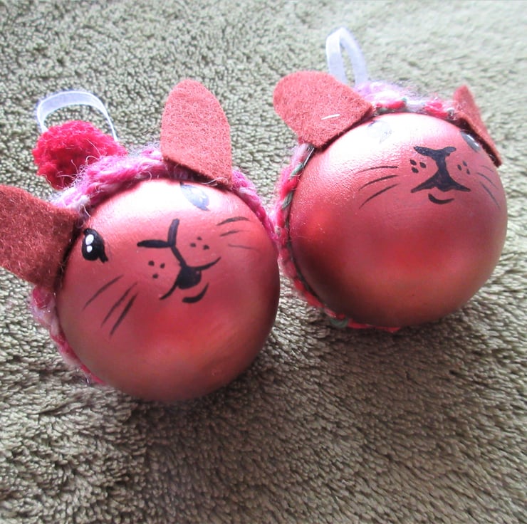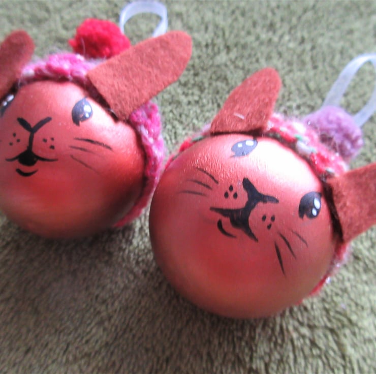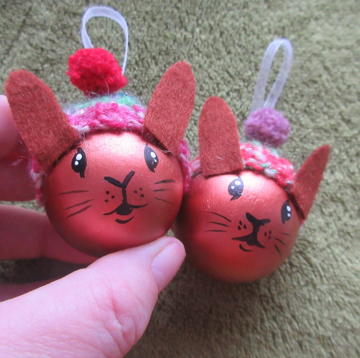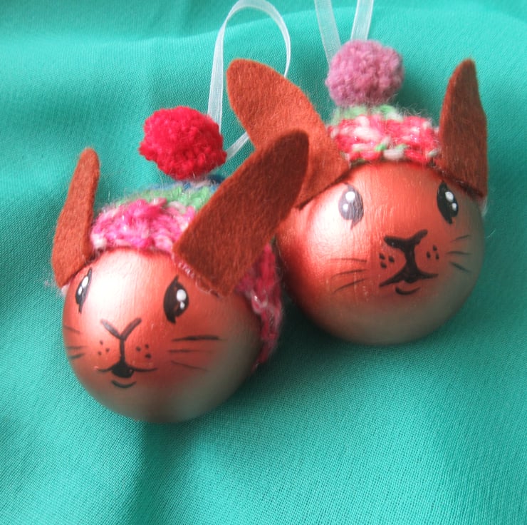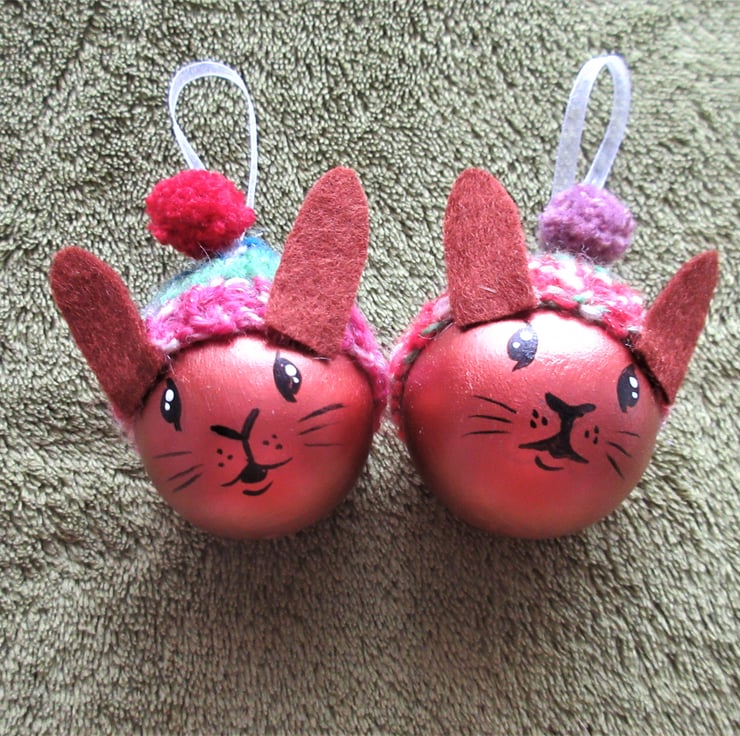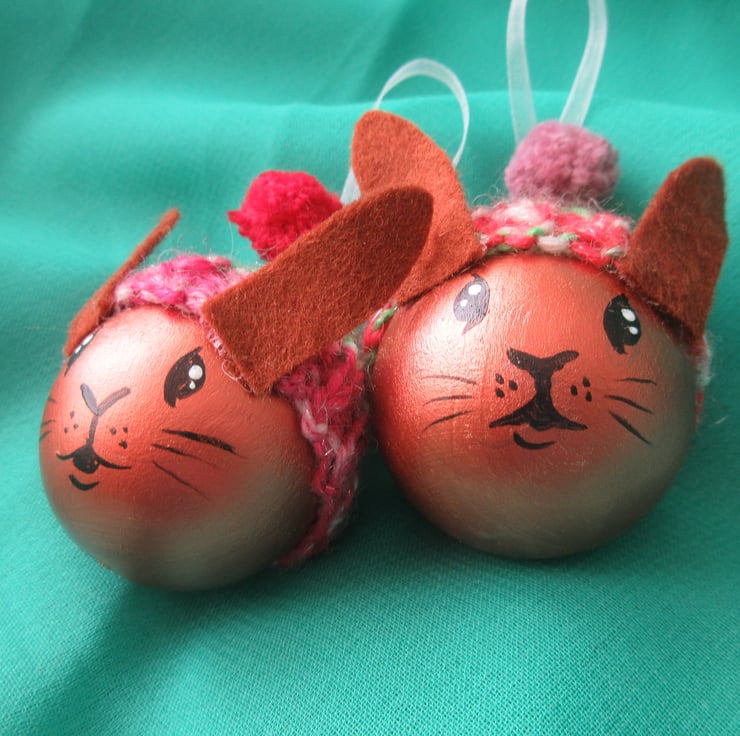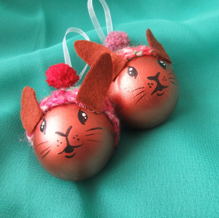 A pair of hand painted wooden baubles, painted to look like rabbits.