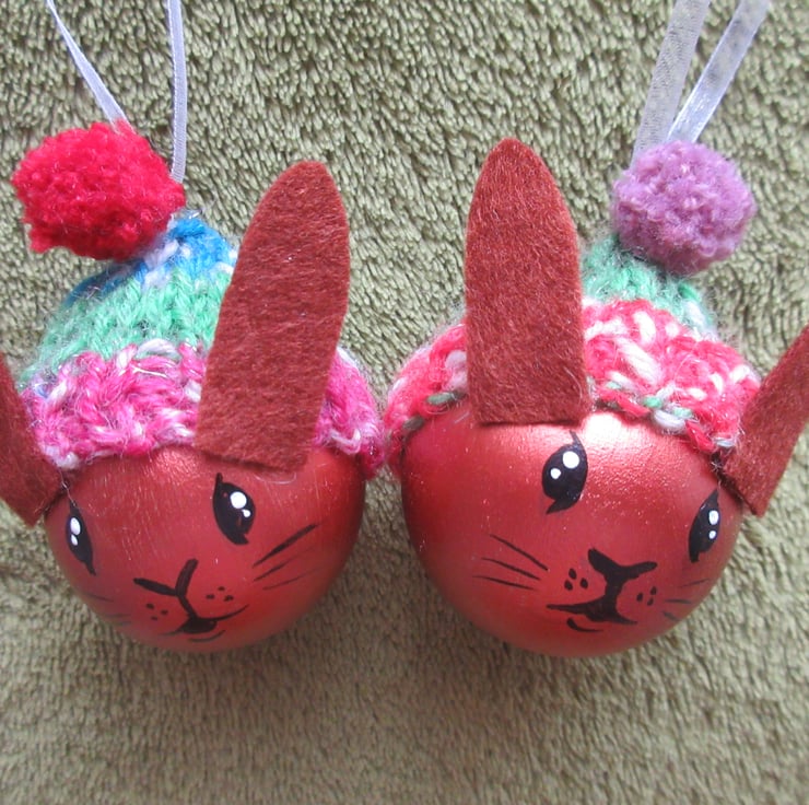 Each bunny is wearing a woolly hat in shades of red, blue and green, and there is a loop of ribbon for hanging the bauble by.