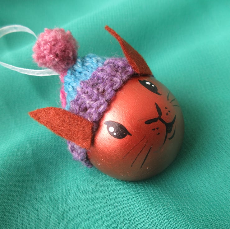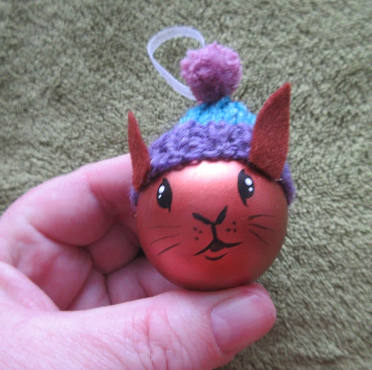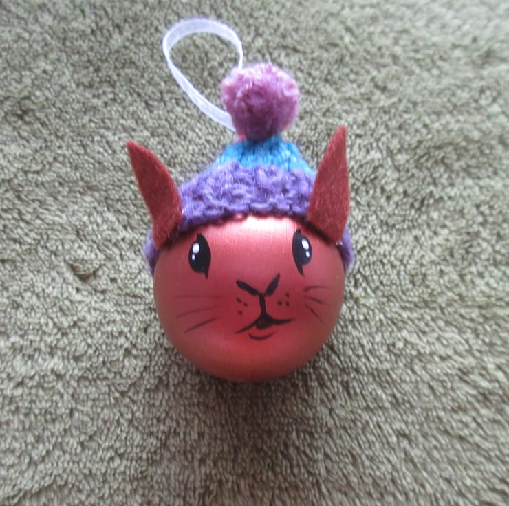 A hand painted wooden baubles, painted to look like a rabbit.
