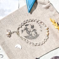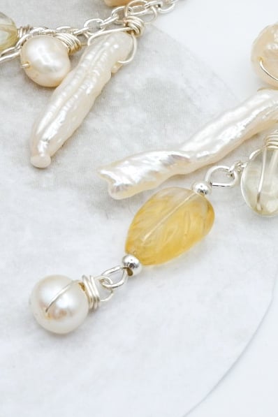 The Citrine gemstones are a beautiful golden yellow, complmenting the hand-carved Fluorite gemstone leaf charms, while the baroque ivory freshwater pearls add a touch of cosmic chic!