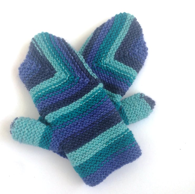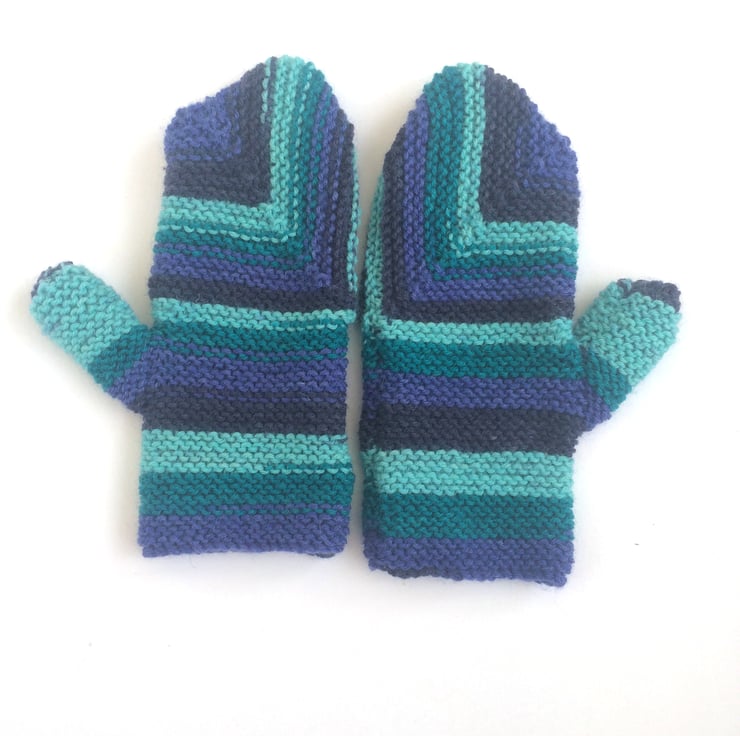 Simple black and blue coloured garter stitch mittens with unusual stripe feature. Lovely warm hand knitted mittens. These cozy mitts are knit in a British 100% wool yarn in dark blue, black & turquoise. Will fit a small / medium sized ladies hand.