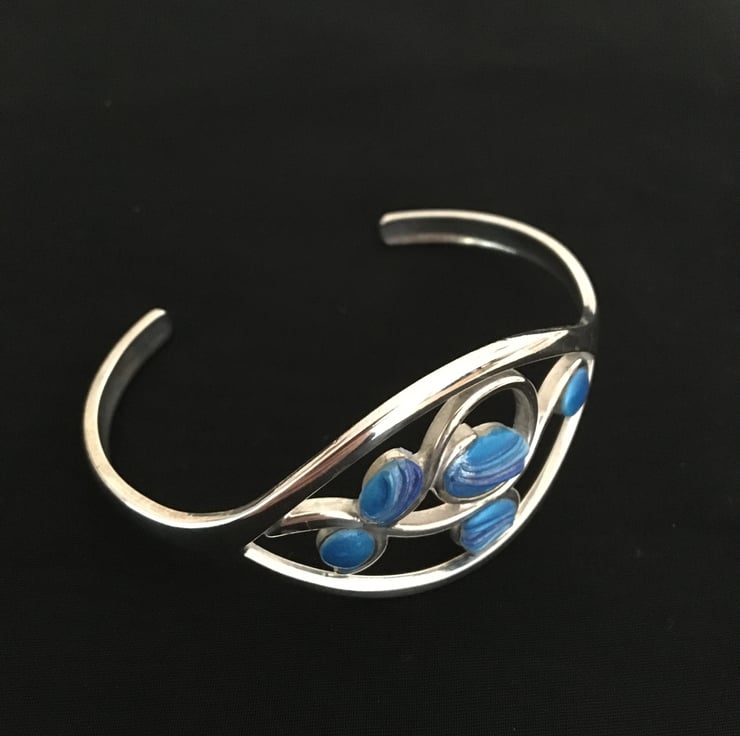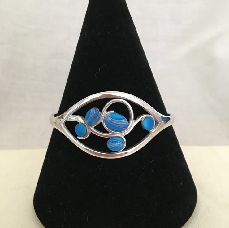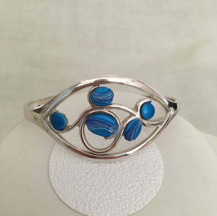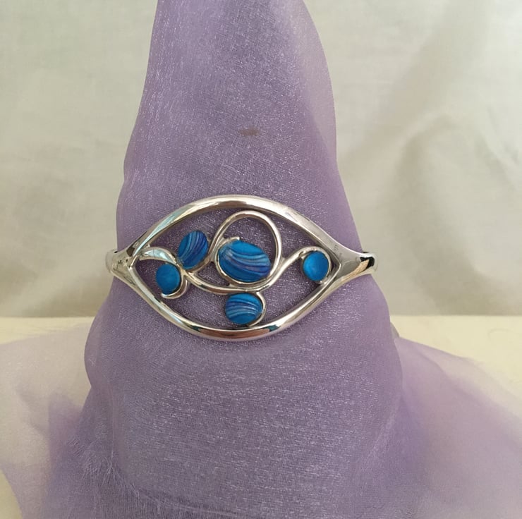 The bangle fits a 7ins wrist comfortably but no larger. The end gap for slipping over the wrist measures 1.25ins.