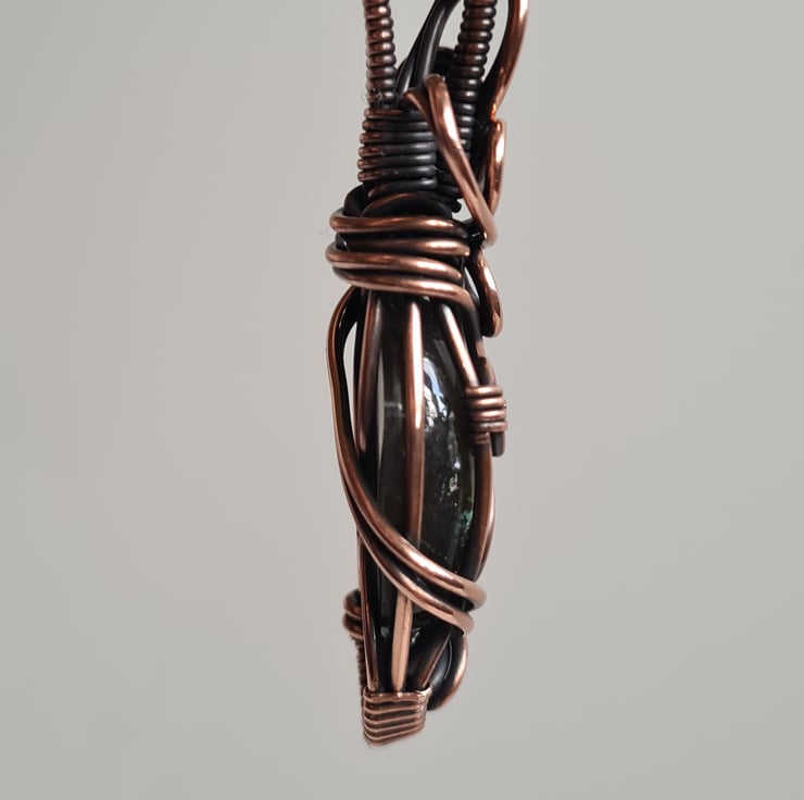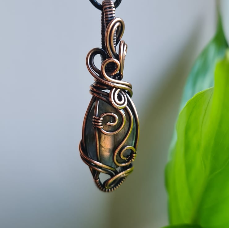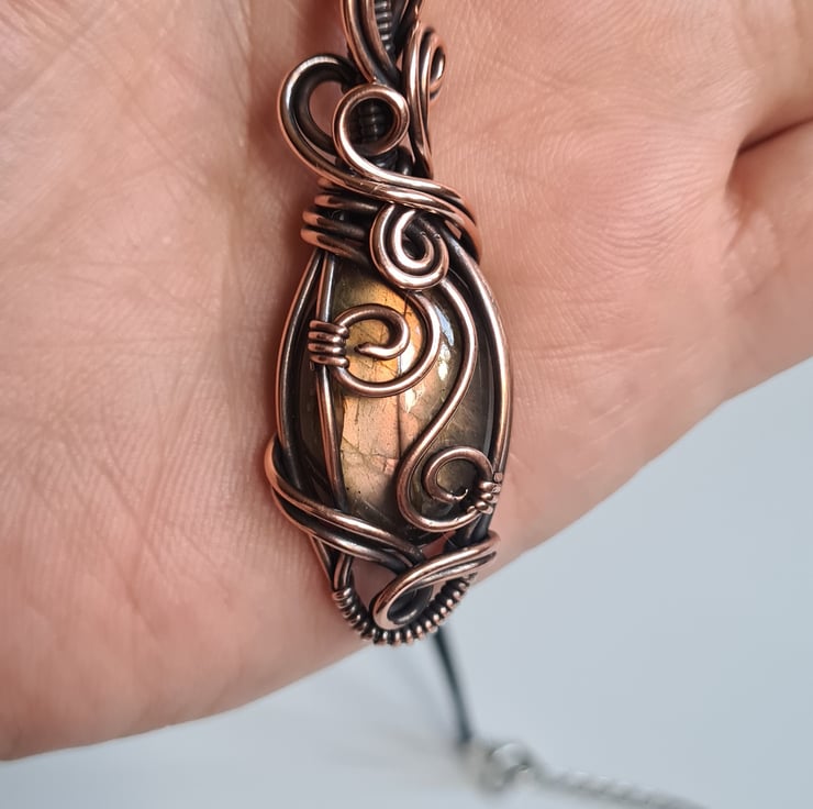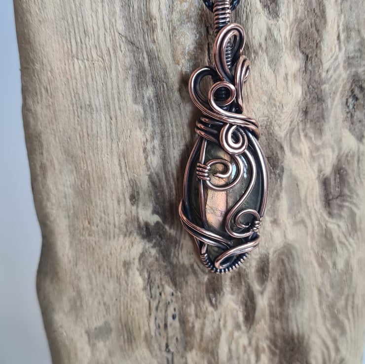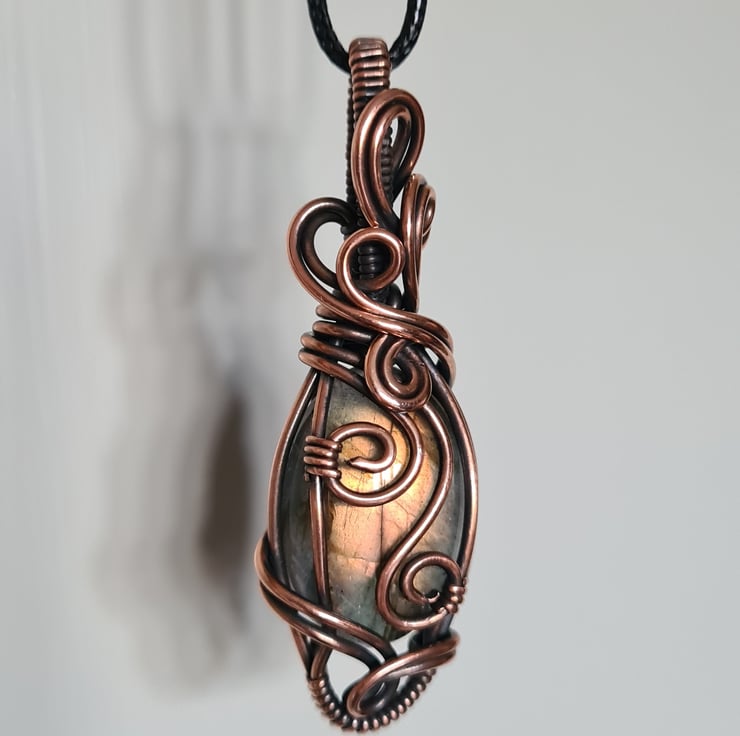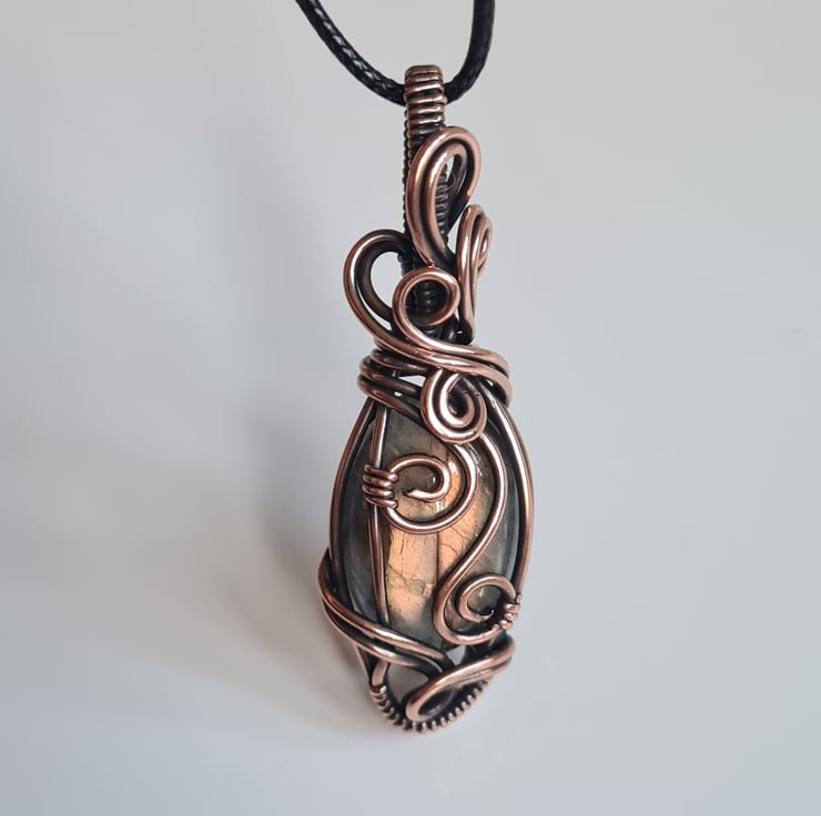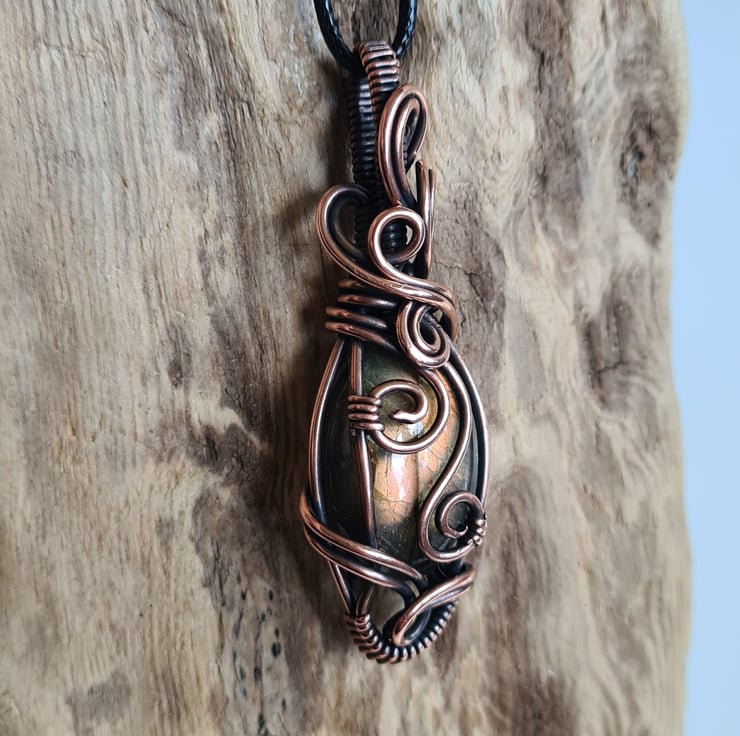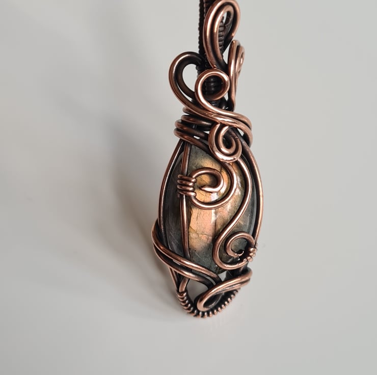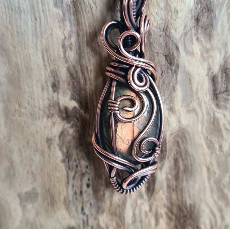 This lovely Natural Labradorite stone is a beautiful mix of colours depending on the light of the room. A mix of gold, burnt orange and a hint of pink all mixed together and these colours look great teamed with the copper.
